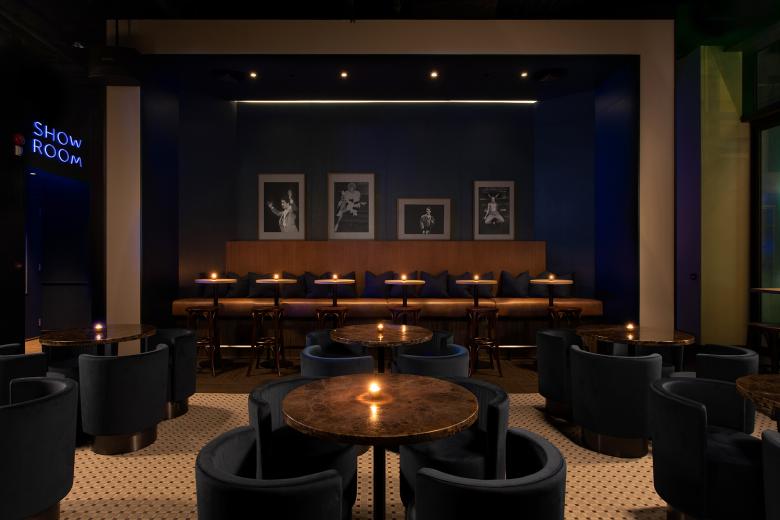 From the outset the client directed hcreates to do something that would stand the test of time. The materials and textures chosen were inspired by the era of Charlie Chaplin and derived as a contemporary take on an early 20th century aesthetic. We wanted to both contextualise the ‘performance’ aspect of the space and juxtapose the modern metropolis of Hong Kong. Designed with this timeless aesthetic in mind, the space was approached holistically rather than featured around a specific element or with a trend-based approach. Blue, and particularly the luminescent logo blue, was a key colour direction from the outset. hcreates responded by utilizing dark/ deep hues with varying textures to help create impact while not overwhelming the space. The burl in the bar is a particular material we enjoyed exploring, as it is quietly unexpected and subtly references this vintage design aesthetic.