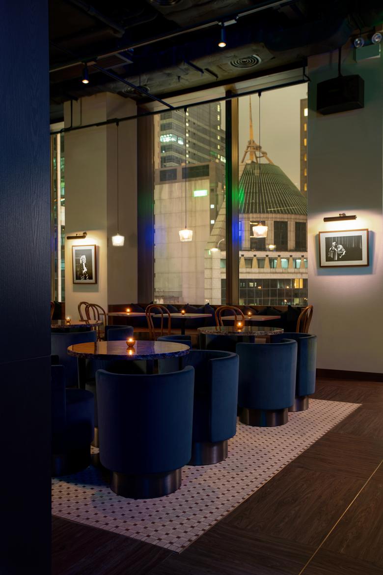 The design team realized the importance of creating a sense of comfort and cosiness, within what was essentially a hard, glazed concrete shell. An urban city can be hectic and intense place to live, so the venue had to be a softer and inviting experience. The blue hued, monotone entrance acts as a mediator, transporting visitors from the city below and allowing a sense of pause before entry.