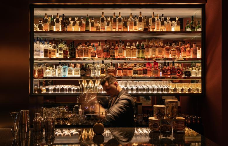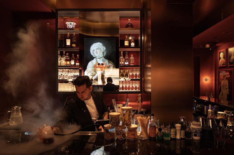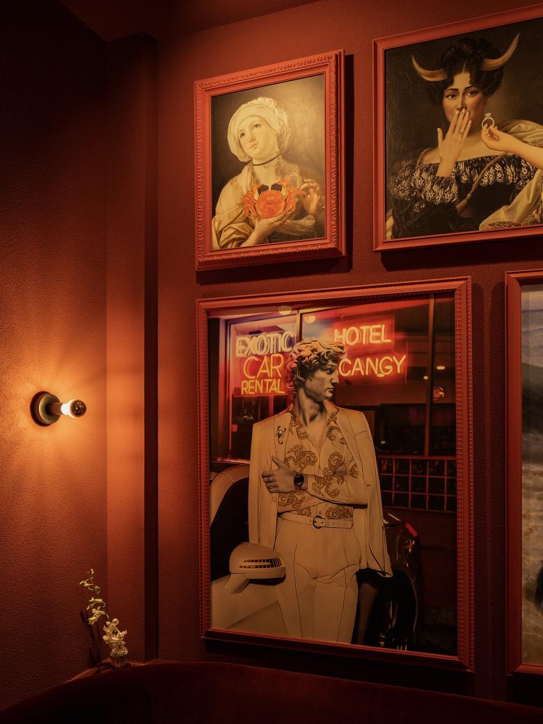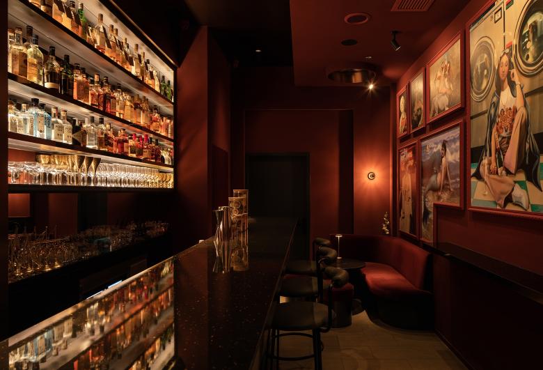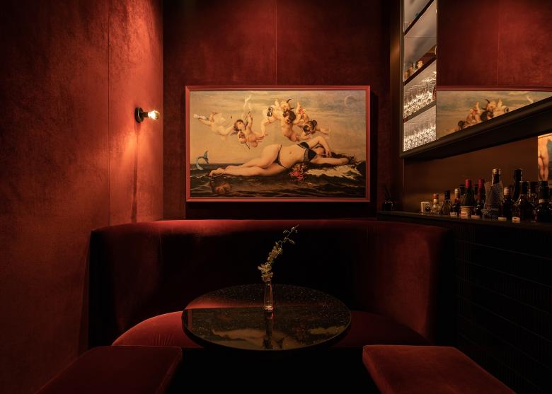 Shanghai’s Jing An District has a new moody and atmospheric cocktail bar centred around signs of the zodiac. The space was previously a soulless real estate office before the Zodiac team set upon turning it into a trendy cocktail bar, in the now thriving neighbourhood of ShanghKang Li. Award-winning hospitality design studio hcreates set about to create a dramatic space with deep red walls that envelop the intimate space. From the street a large, copper tinted, picture window gives you a glimpse into the action, beckoning you inside. Upon entering you step into a small, darkened foyer, designed to bring a moment of quiet and anticipation. You then journey up and emerge in front of a gleaming, copper sunken bar, serving up star sign inspired cocktails led by mixologist, Geo Valdivieso. The central sunken bar is hcreates Design Director - Hannah Churchill’s favourite feature, “I wanted to bring a sense of theatre by creating a stage for the bartender, allowing the customer to view the action from a higher angle”. The bar features a DIY station where customers can participate behind the bar, making their own cocktail with the bartender. A one-way mirror behind the bar turns into a screen, playing their own dynamic, zodiac visual as they perform. Throughout the venue, plush, velvet, banquette seating form cosy pockets, allowing for both open and private space. The dramatic red walls provide a rich backdrop for the zodiacs. Each star sign has been reinterpreted and brought to life by creative agency, The Orangeblowfish, with edgy, baroque art, being cleverly reimagined and created to span along one entire wall of the venue. The overall space has a warm and cosy vibe with many playful elements to explore as people sit and back and enjoy their very own Zodiac cocktail.