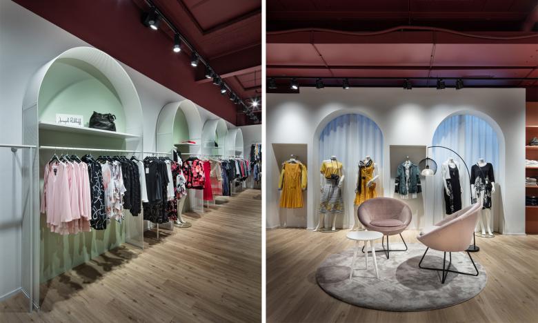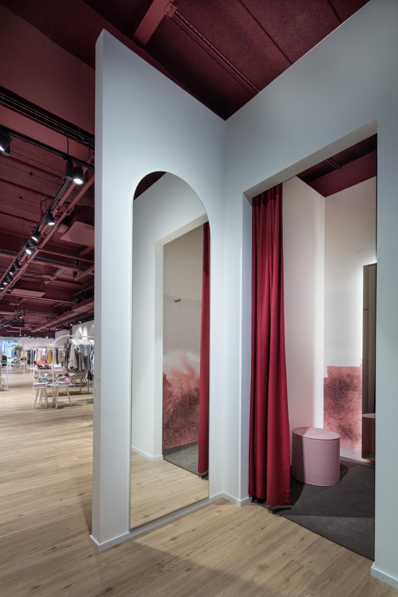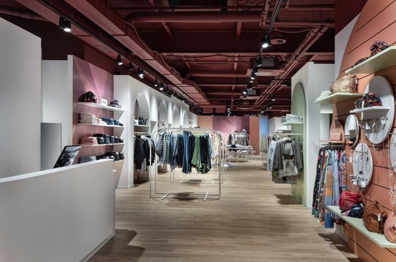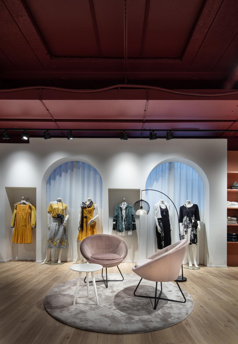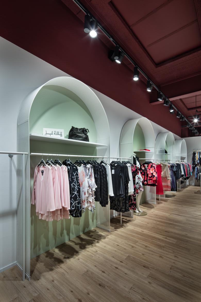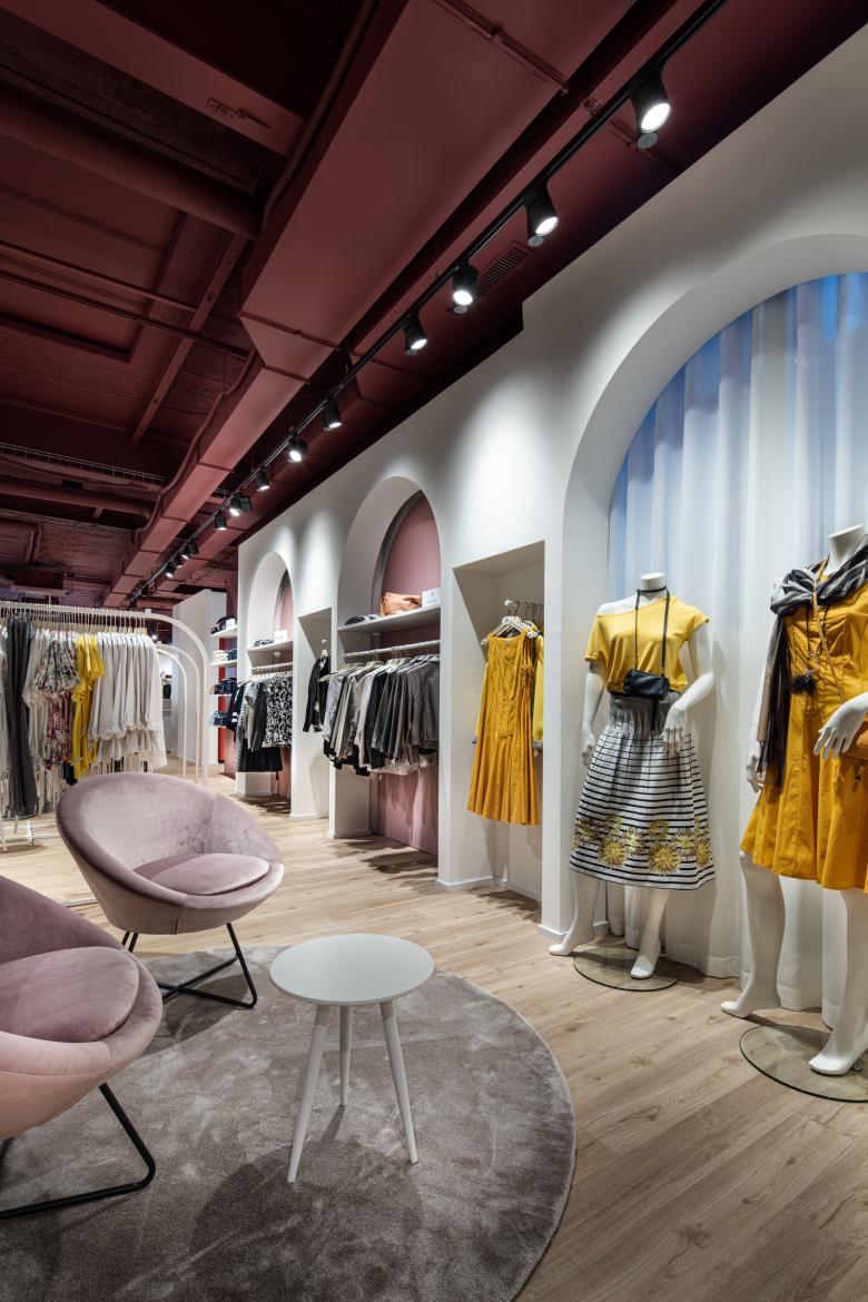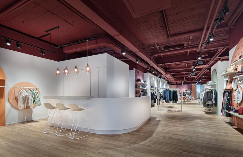 Seit Ende Januar 2020 präsentiert sich die BONSAVER Mode AG in den neuen Räumlichkeiten und das in einem außergewöhnlichen und überaus einladenden Shop-Design. Die prägnanten und durchlaufenden Stil- und Formelemente sind der Kreis sowie der Bogen. Diese vereinen die einzelnen Modethemenwelten, auf 300 qm, zu einem stimmigen Ladenbau- und Mode - Gesamtkonzept. Die großzügige Verkaufsfläche ist hell, freundlich und brillant. Die Decke wurde offen, im Industriestyle gehalten, in einem dunklen Bordeaux jedoch auf das Mobiliar und großflächige Aquarell-Wandgrafiken abgestimmt. Jeder Themenbereich ist stimmig. Sowohl vom Warenträgersystem, dem Mittelraummobiliar und den gestalterischen Grundformen. Durch separierte und eigene Möbelfarben entsteht eine natürliche Segmentierung der Fläche und somit der Modewelten. Weich und erfrischend sind die gewählten, pastelligen Farben, die sich von einem starken Bordeaux, über ein warmes Orange bis zu einem weichen Grün in Ihren Bereichen präsentieren und damit eine jeweils individuelle Atmosphäre schaffen. Die bunten Farbakzente wirken durch den gezielten Einsatz der abgerundeten Elemente als Eyecatcher - nicht überladend sondern unterstützen das leichte und feminine Ladenkonzept. Innerhalb der Gesamtfläche des Ladenlokals finden sich gemütliche Sitzinseln und Kabinenbereiche sowie eine puristisch anmutende Bar. Jeder dieser Bereiche fügt sich, durch Form und Farbe, harmonisch in den Verkaufsraum ein. Dabei schenkt der Bodenbelag in Natureiche-Optik eine besondere Gemütlichkeit und Wärme. Die großen und transparent gestalteten Schaufenster laden die Kundinnen zum Entdecken des neuen Ladendesigns und neuer Modethemen ein.