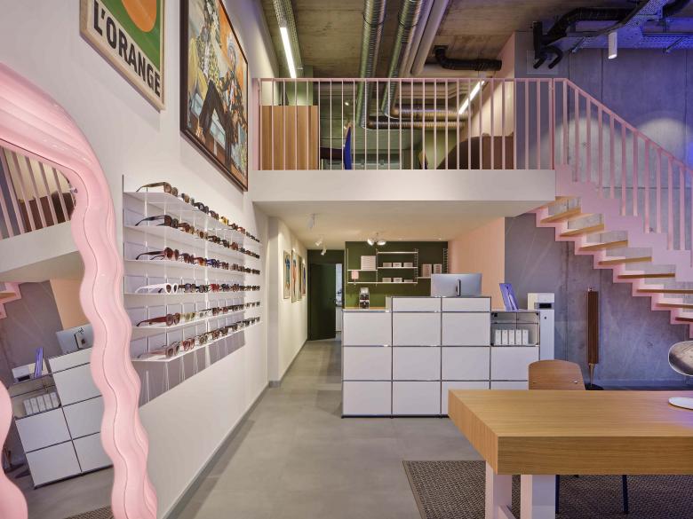 Die Korrekturbrillen sowie die Sonnenbrillen finden sich, geradlinig präsentiert, auf klassischen USM Haller Möbeln wieder. Durch die beeindruckend hohe Glasfassade gewinnen Passantinnen und Passanten einen fantastischen Einblick in dieses großzügige Brillenatelier.