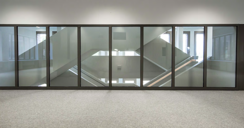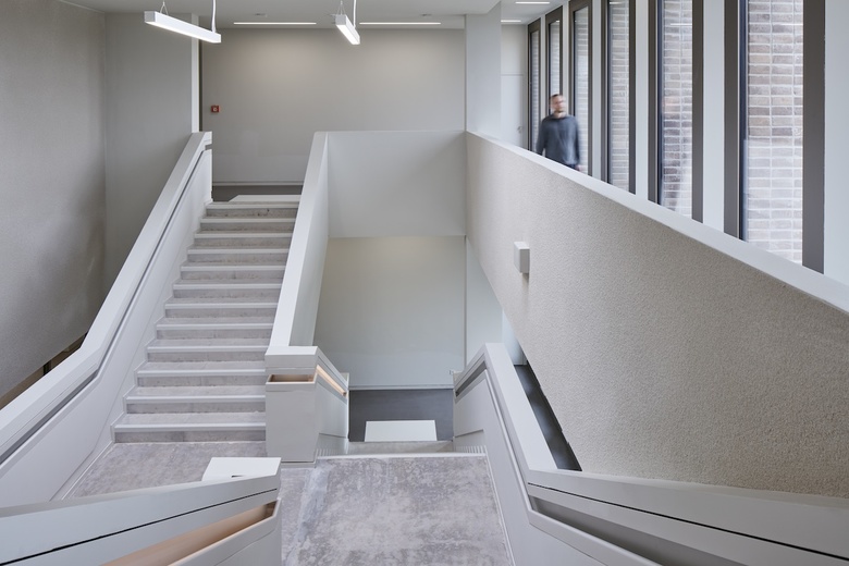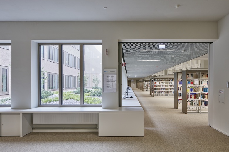 Er bildet zum Stadtplatz und zum Campus-Forum stadträumlich wirksame Baukanten, definiert so den öffentlichen Raum als Adresse und übernimmt mit deutlicher Setzung die Funktion des Entrées zum Campus. Die Eingänge erfolgen entsprechend von beiden städtebaulich wichtigen Seiten über gedeckte Vorbereiche in das Bibliotheksfoyer. Wie eine fließende Raumlandschaft öffnet sich dieses wechselseitig zu den Außenräumen und vernetzt dadurch den Campus mit der städtischen Nachbarschaft.