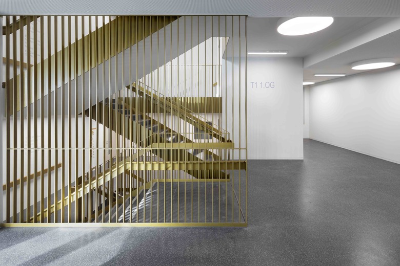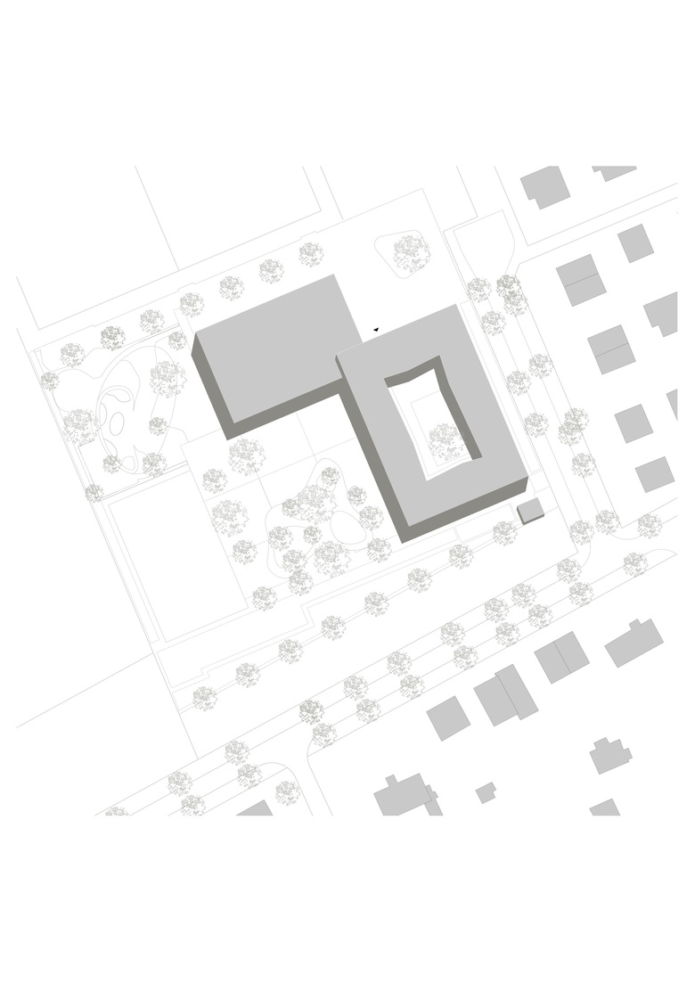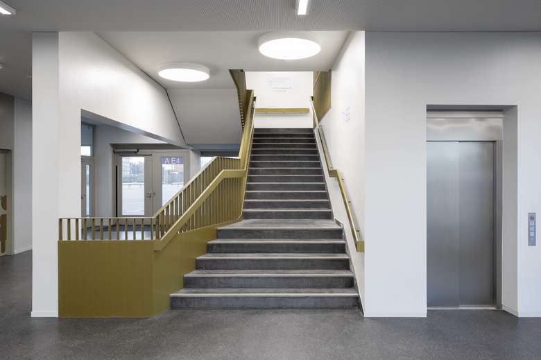 Die Schule im nördlichen Grundstücksbereich orientiert sich mit ihren Baumassen zum Wohnquartier und ermöglicht dadurch zusammenhängende schulisch genutzte Freiflächen nach Süden. Die Körper der Schule und der Sporthalle bilden ein zusammenhängendes Bauensemble. Dieses erzeugt mit seinen baulichen Kanten einen öffentlichen Raum, einen frei begehbaren Platz mit Baum und Sitzbank als Adresse der Grundschule im Wohnquartier. Der Haupteingang in die Schule erfolgt von diesem Platz. Im Inneren, an der Schnittstelle von Schulhaus und Sporthalle, verbindet eine zentrale Treppenanlage als Binnenraum alle Ebenen zu einer räumlich-funktionalen Einheit. Von hier werden visuelle Verbindungen zwischen den Wand an Wand liegenden Gebäudeteilen der Schule und der Sporthalle über Sichtfenster hergestellt. Integrierte Sitzbänke im gemeinsamen Foyer und auf den Zwischengeschossen der Treppe bieten Raum zum Verweilen an.