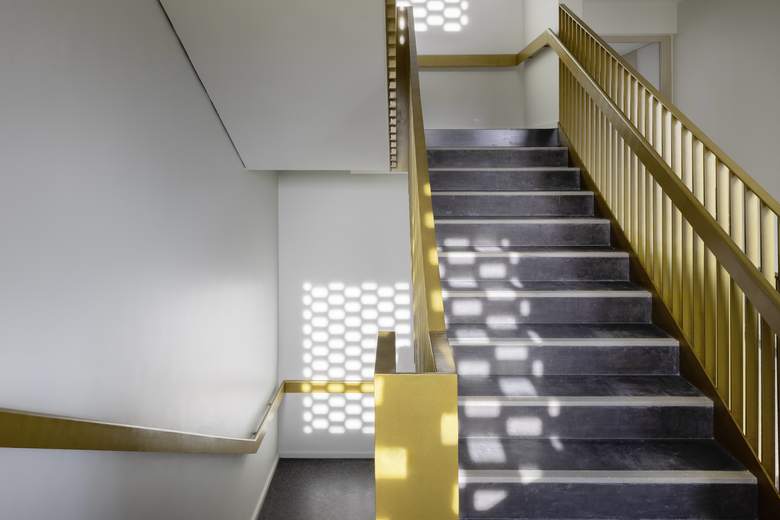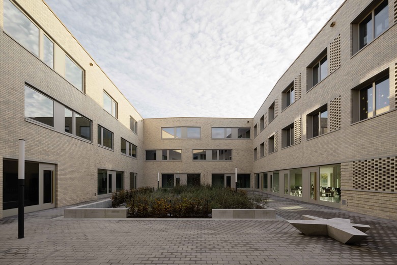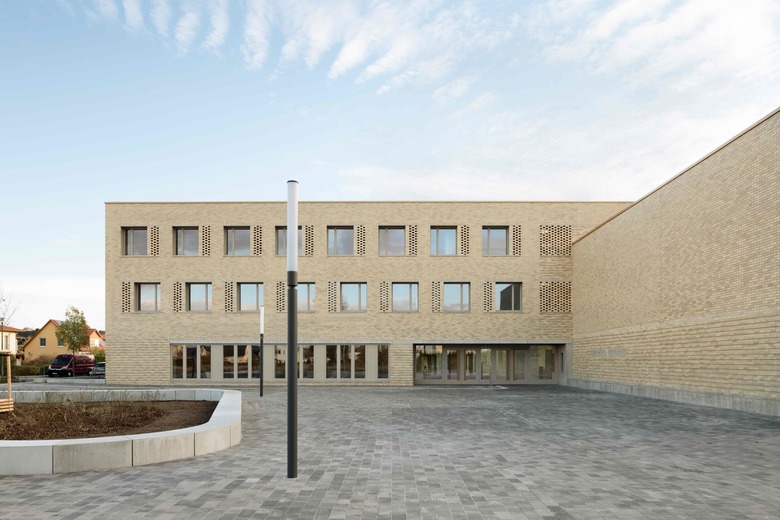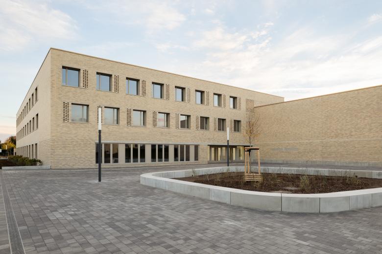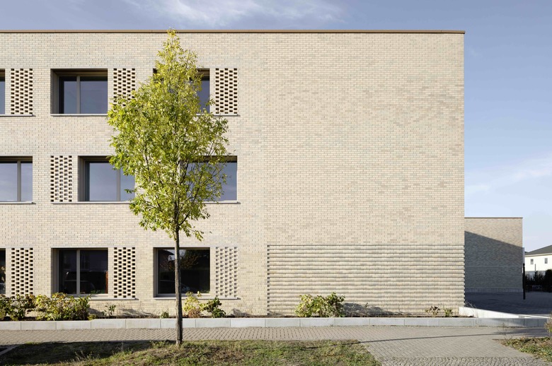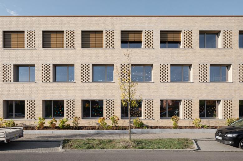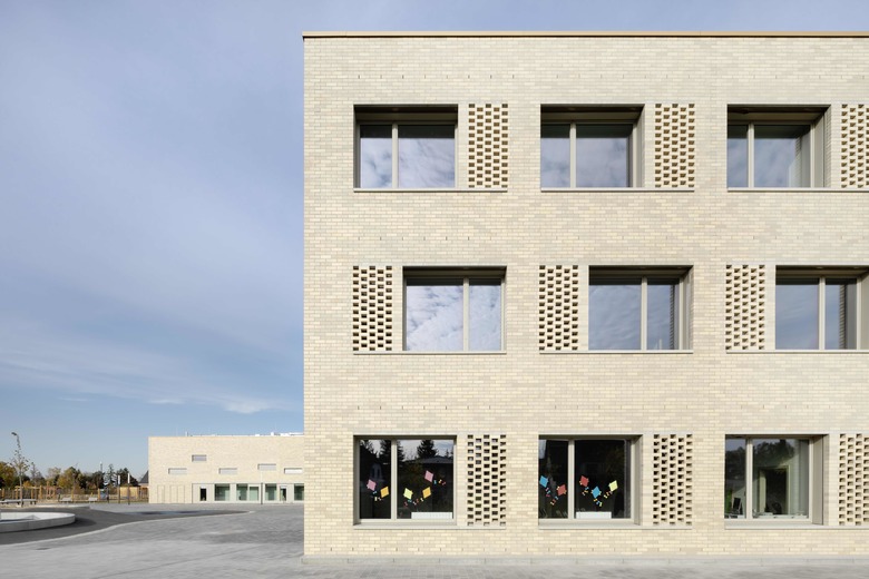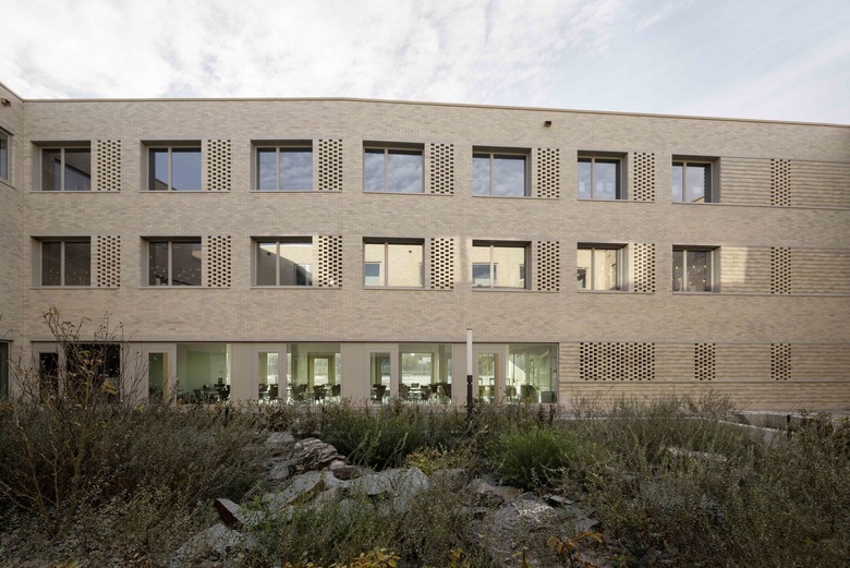 Die Außenfassaden wurden umlaufend mit hellen Ziegeln bekleidet. Klinkerreliefs gliedern die Ziegelfassade, Felder mit Gittermauerwerk ermöglichen über dahinterliegende Öffnungsflügel eine geschützte Fensterlüftung. Die Fenster sind Holzfenster. Die Innenhoffassade wird mit gezielten Durchblicken gestaltet.