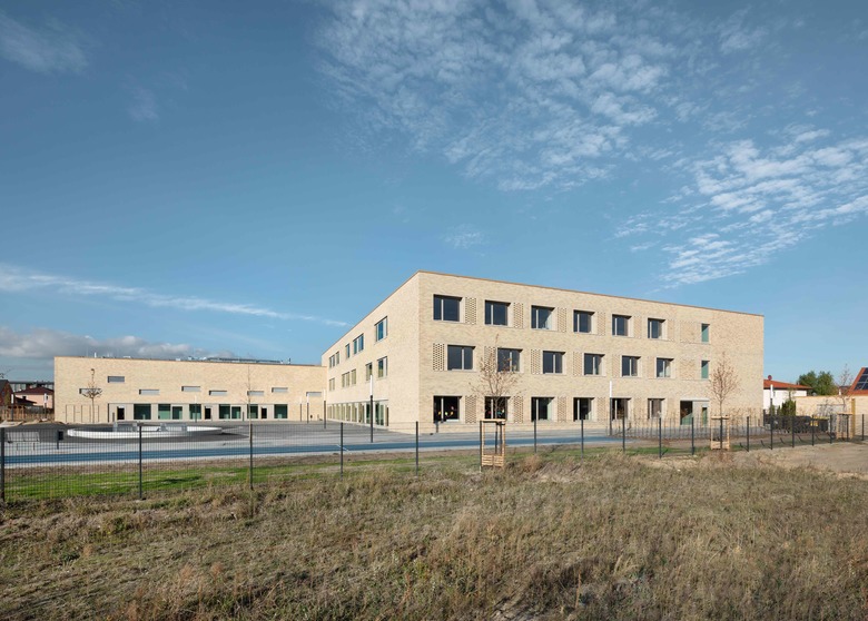 Schon 1998 wurde ein Architektenwettbewerb für den Neubau der Grundschule mit Sporthalle an diesem Ort entschieden. Die Planung für den Schulneubau geht auf den prämierten Wettbewerbsentwurf von Reimar Herbst / HerbstKunkler Architekten aus Berlin zurück. Erst nach über 10 Jahren wurde der Wettbewerbsentwurf wieder aus der Schublade geholt und durch die Wettbewerbsgewinner den aktuellen Erfordernissen einer 3-zügigen Grundschule im offenen Ganztagsbetrieb angepaßt. Das städtebauliche, baukörperliche und funktionale Konzept aus dem Wettbewerb konnte weitgehend übernommen werden: