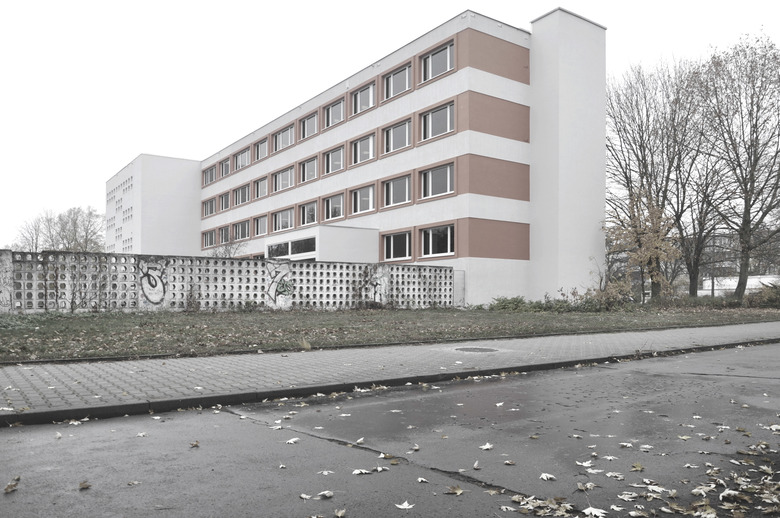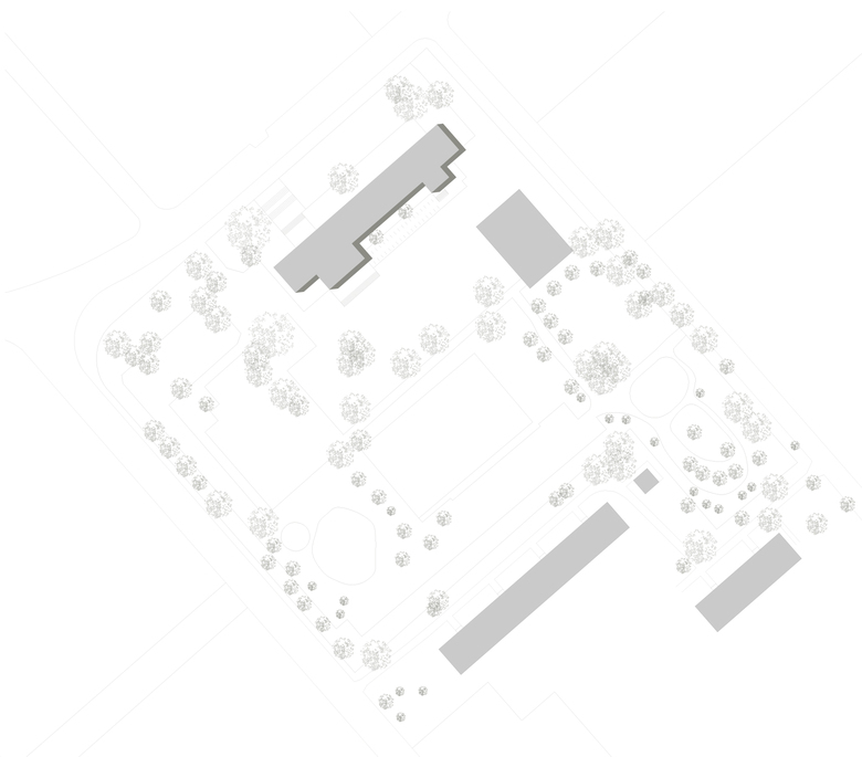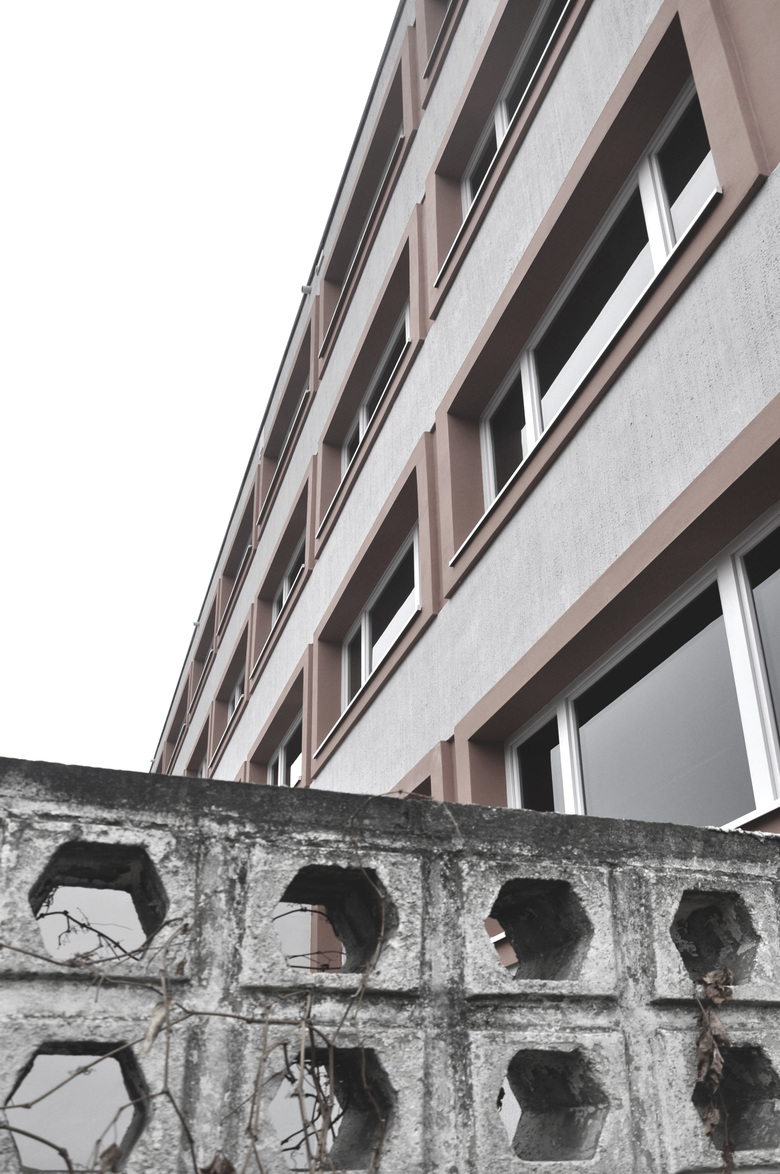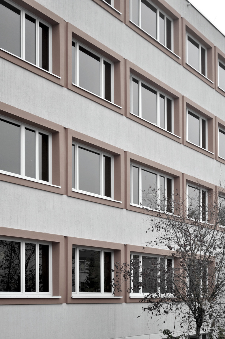 Die vorgefundenen Fensterbänder an der Nord- und Südfassade wurden als umlaufendes Band auf die gesamte Fassade projiziert. Die bestehenden Brüstungselemente aus Stahlbeton wurden erhalten und außen nach energetischen Vorgaben gedämmt. Die Einbaulage der Bestandsfenster wird bei der Erneuerung der Fenster wieder hergestellt. Durch den Aufbau der Dämmung auf den Brüstungselementen, den neuen Fensterrahmungen und den dadurch tiefer liegenden Fenstern in drei Ebenen wird die Plastizität der Fassaden verstärkt und das Konzept des Bandes betont. Der Rhythmus der Fensterumrahmungen bildet die Folge der Klassenzimmer und das innere Stützenraster ab.