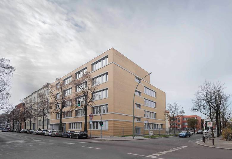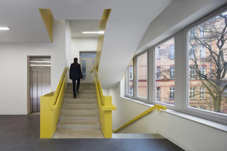 Der fünfgeschossige Neubau schließt direkt an den Altbau an. Er setzt das Altbauvolumen in Höhe und Breite fort, definiert an städtebaulich wichtiger Stelle die Raumkante zur Stadt neu und bildet zum Schulcampus ein Staffelgeschoss aus.