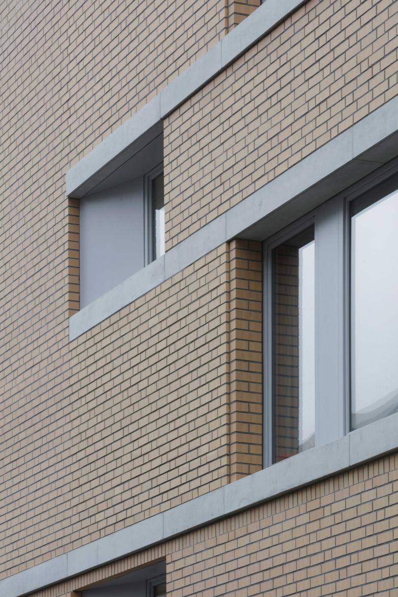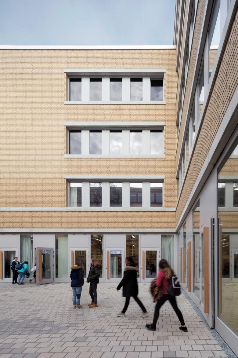 Die Steinfassade des Altbaus zum Schulhof wurde weitergebaut und umkleidet nun, wie ein Steinkleid, auch den Neubau. Neubau und Altbau werden fest zu einer formalen und funktionalen Einheit verbunden.
