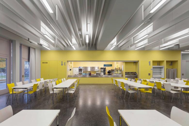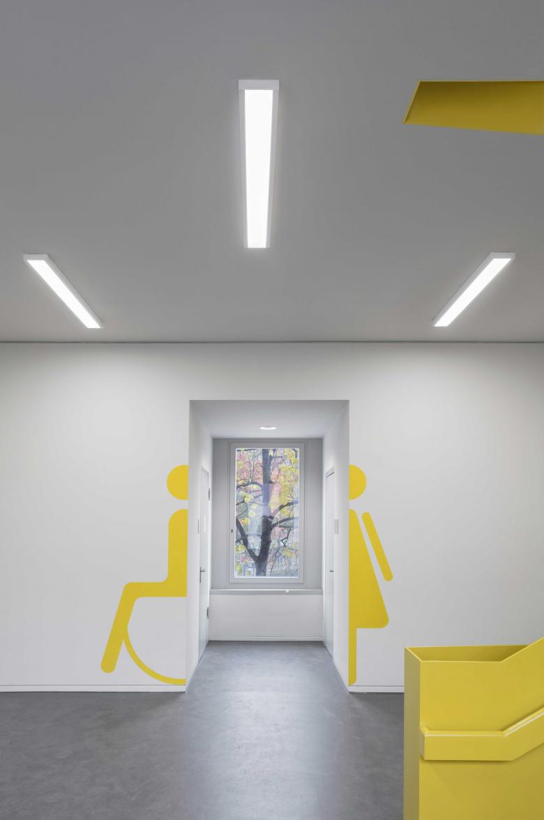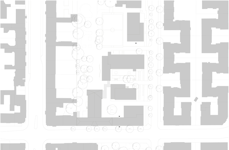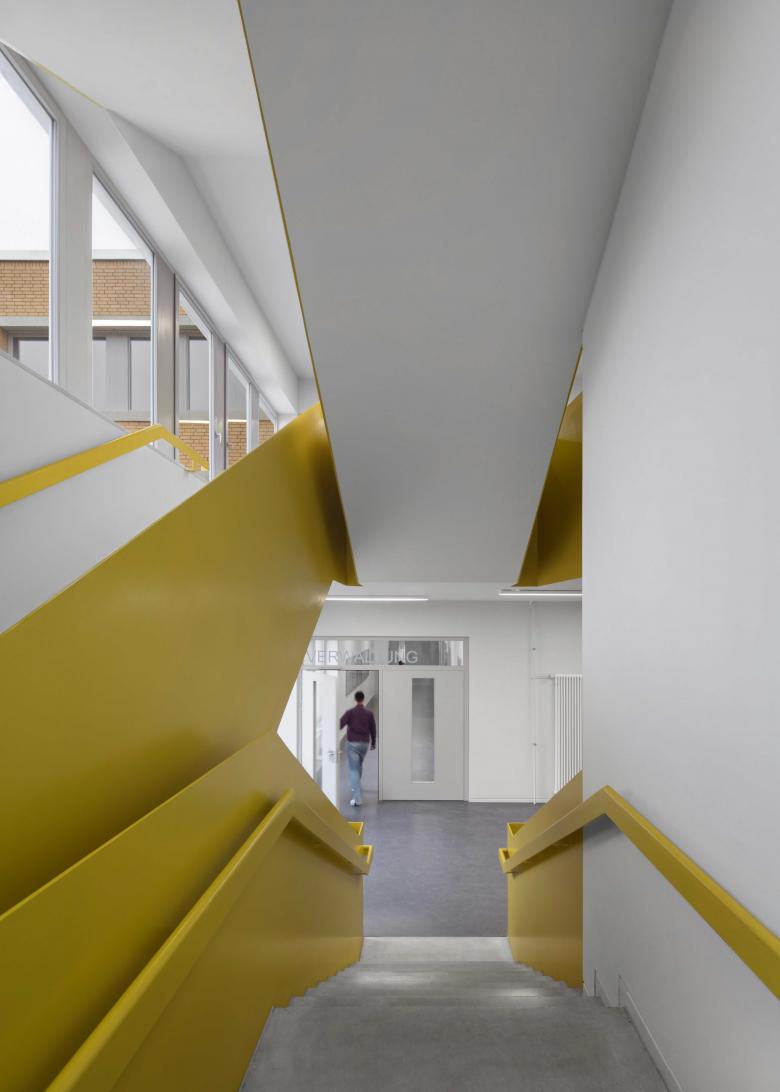Eine offene Treppe mit Aufzug verbindet die verschiedenen Niveaus der Geschosse des Altbaus mit denen des Neubaus im Sinne der erwünschten Inklusion. In den Unterrichtsclustern weiten sich Verkehrsflächen zu flexibel nutzbaren Bereichen. Altbauflure öffnen sich im Neubau zur innenliegenden Schulterrasse mit Baum, dem gemeinsamen Raum mit Identifikation stiftender Intimität. Die Organisation des Schulhauses ist von dieser Idee bestimmt.
