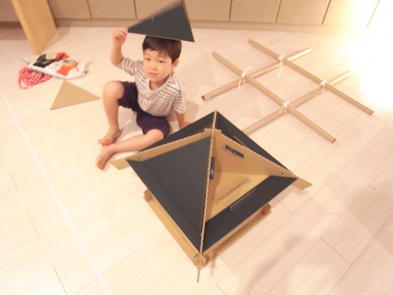 The paper patterns were delivered to kids in Tokyo and New York via the Internet, and they assembled them by cutting out from cardboard that were easily available in each areas with the help of their fathers. Then, on the day of the festival, the children carried OMIKOSHI around the community and shouted, "Wasshoi, wasshoi!"