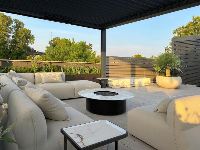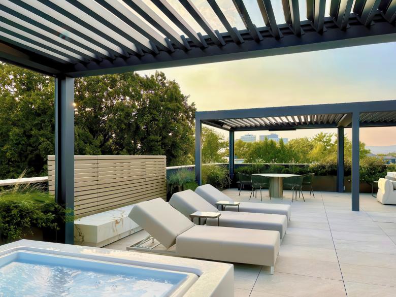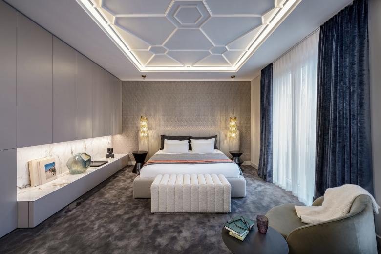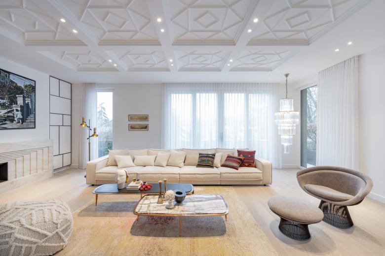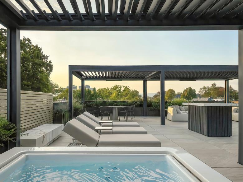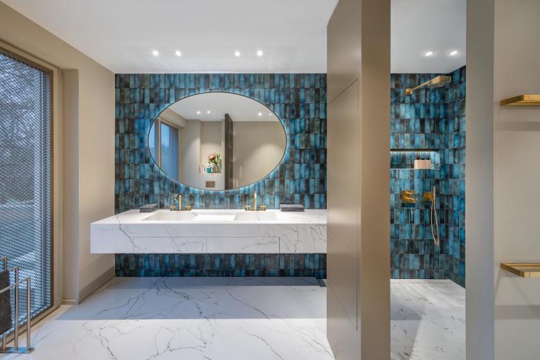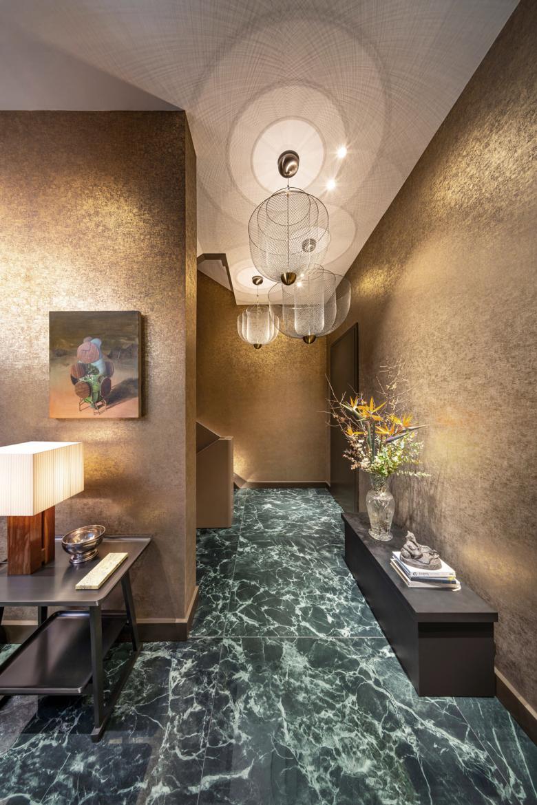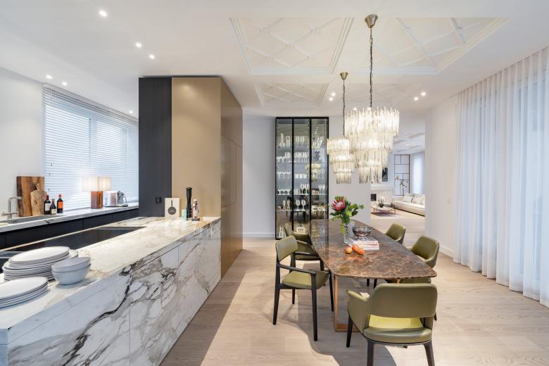 Ein edles Townhouse im Frankfurter Diplomatenviertel wurde von Hollin+Radoske vom Rohbau an individuell geplant und in enger Abstimmung mit den Kunden in eine ungewöhnliche High-End Residenz verwandelt. Auf fünf Ebenen verteilen sich die unterschiedlichen Bereiche vom Gästeappartement, über die Eingangshalle, den Privaträumen, der Wohnebene bis hinauf zur spektakulären Dachterrasse mit Skylineblick, üppigem Grün, verschiedenen Sitzbereichen und dem Jacuzzi-Pool. Hollin+Radoske entwickelte eine durchgehende Designphilosophie. Die vorherrschenden Elemente weißer Marmor, Gold und darauf abgestimmte, umfangreiche Einbauten, führen zu einem harmonischen und vor allem auch persönlichen Gesamtkonzept.