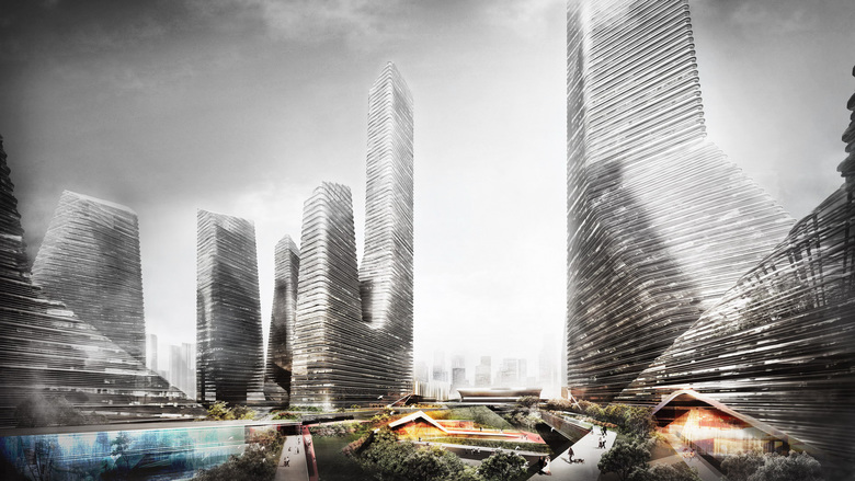 When we started to think about how to create a new world-class landmark city, a 600-year-old Chinese landscape painting became the original source of inspiration. The landscape painting depicts high mountains, dramatic rock peaks and concisely portrays the spirit of Chinese traditional culture. Combined with modern design concepts, we used the spirit of the Chinese landscape painting as the principle behind our design of space and architectural form.