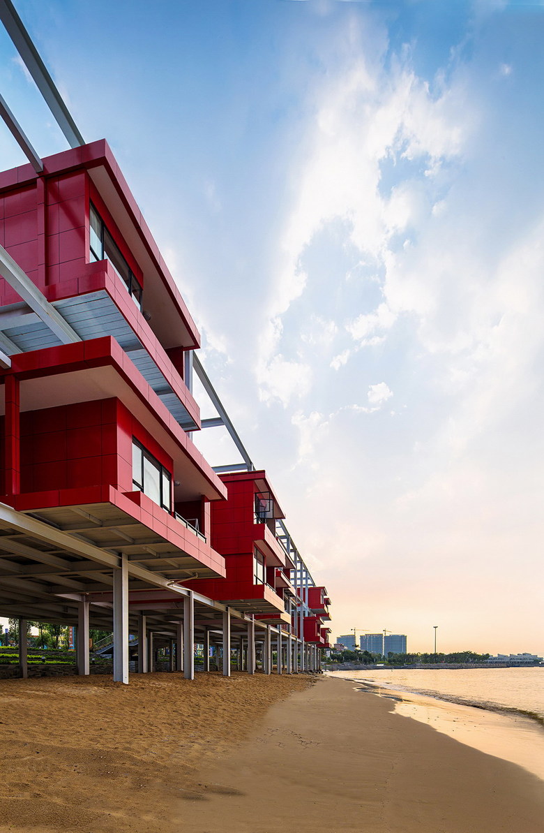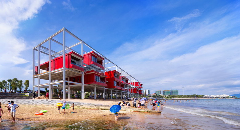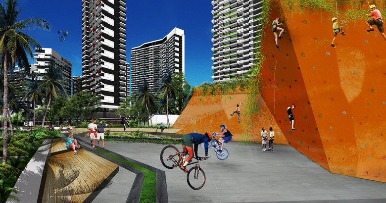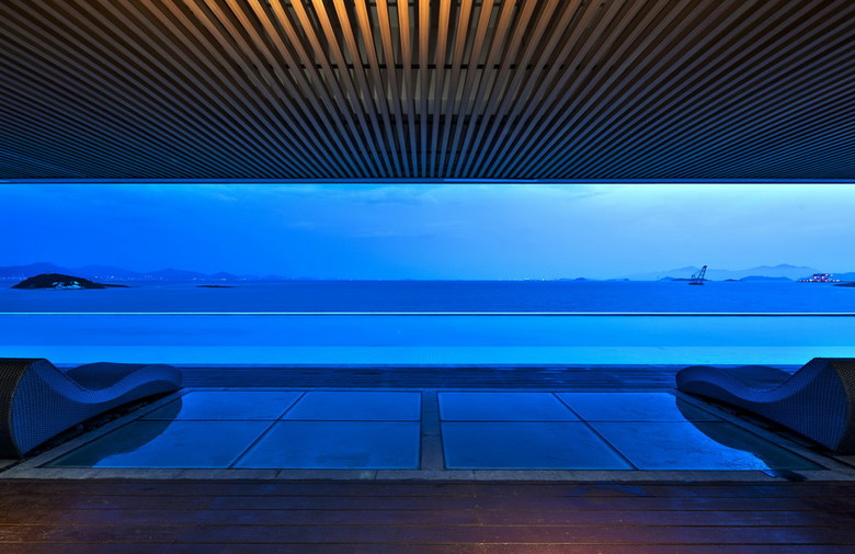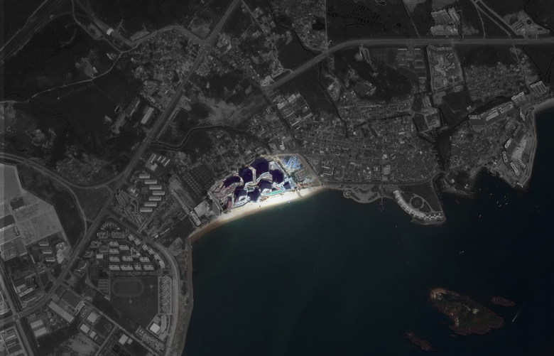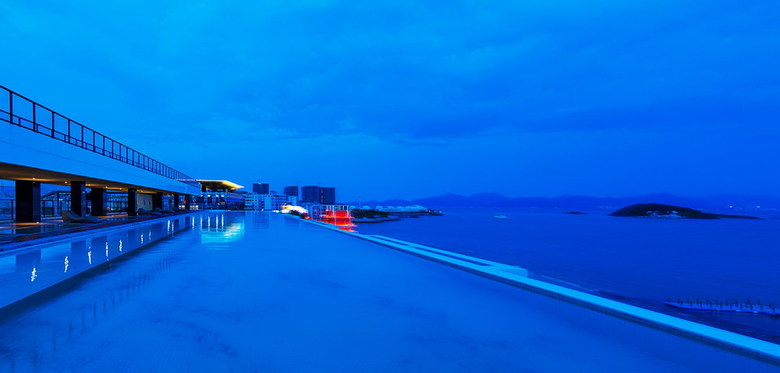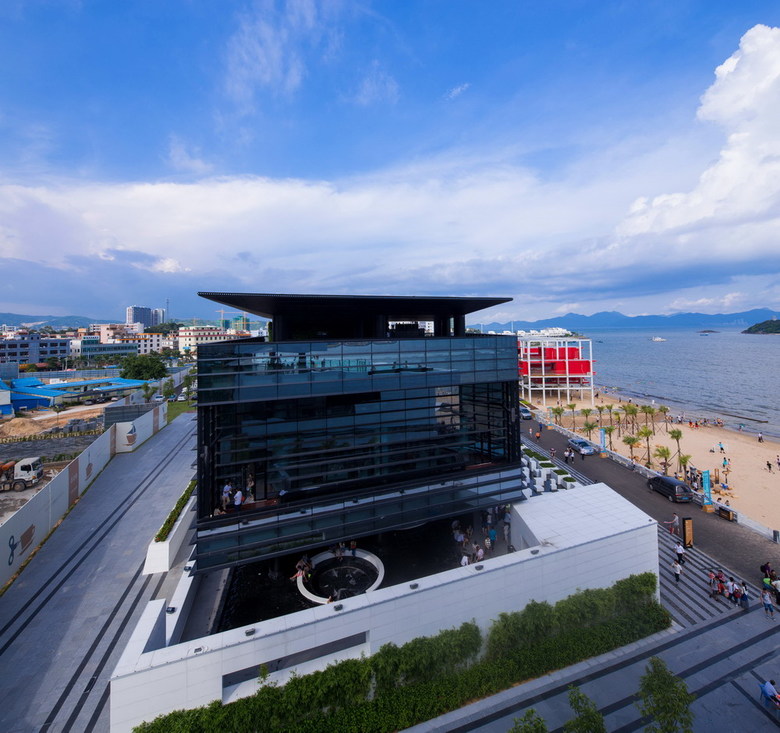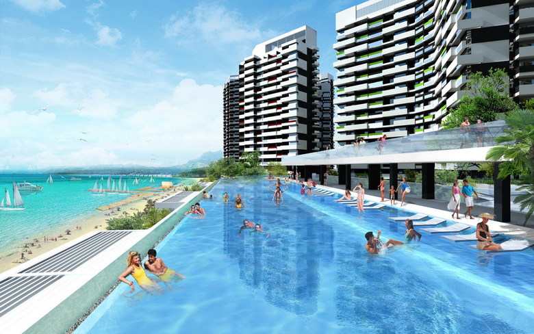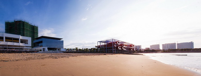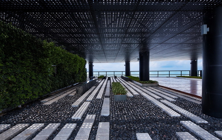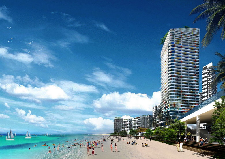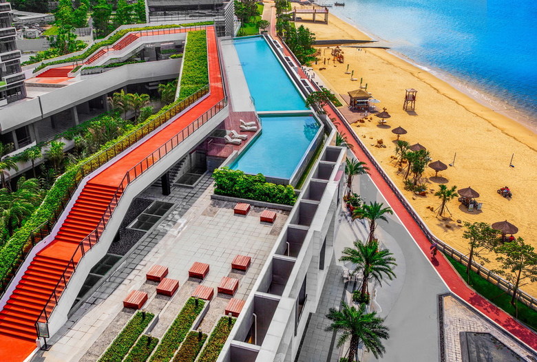 景觀語言現代簡約,注重平面構圖、綠化、鋪裝與景觀小品形成一氣呵成的流暢感,每個裙樓體塊內部形成獨立的主題庭院,同時又各自連接到中心庭院;不同高度的垂直綠化,裙樓景觀和屋頂花園,構建大型的生態社區;水元素是濱海專案的主題,而這一主題不應僅僅限於在海灘上,設計中在裙樓與屋頂提供了不同高度的水景以及無邊界泳池,極大地豐富不同層次的水上體驗。