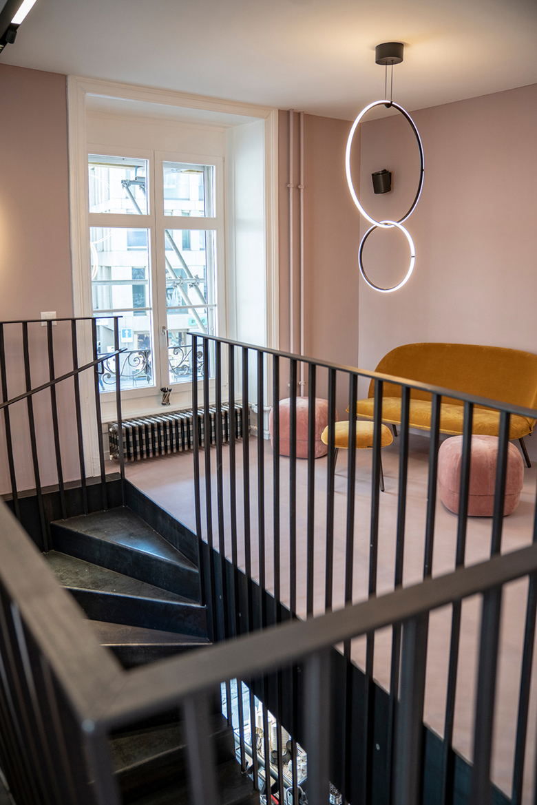 Nicht zu übersehen ist auch die neue abgehängte Metalltreppe, die mit ihrer filigranität und den ersten beiden Stufenblöcken im Boutique Shop einen grossen Akzent setzt.