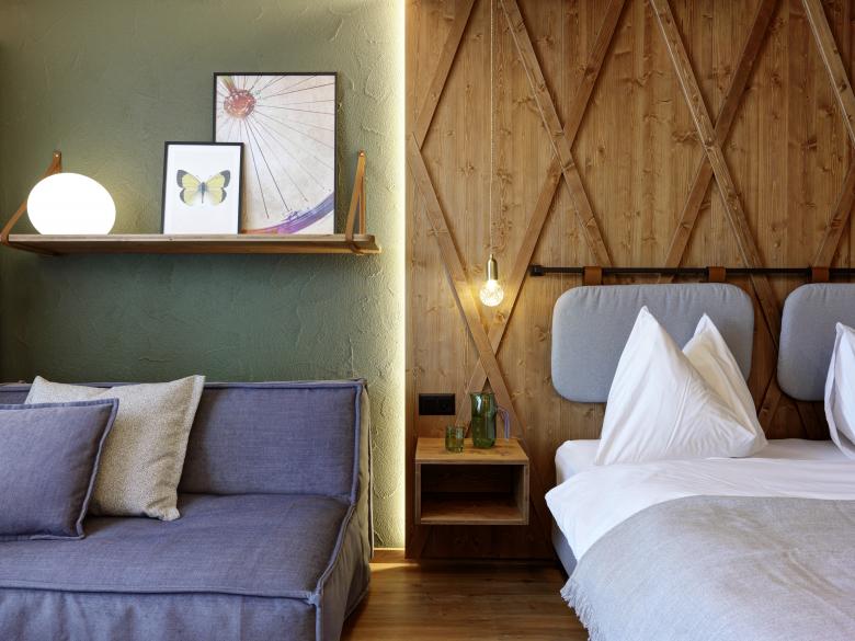 Das Farb - und Materialkonzept, welches die Naturthemen Berge, Wald und Wärme aufgreift, charakterisiert die drei Zimmertypen.