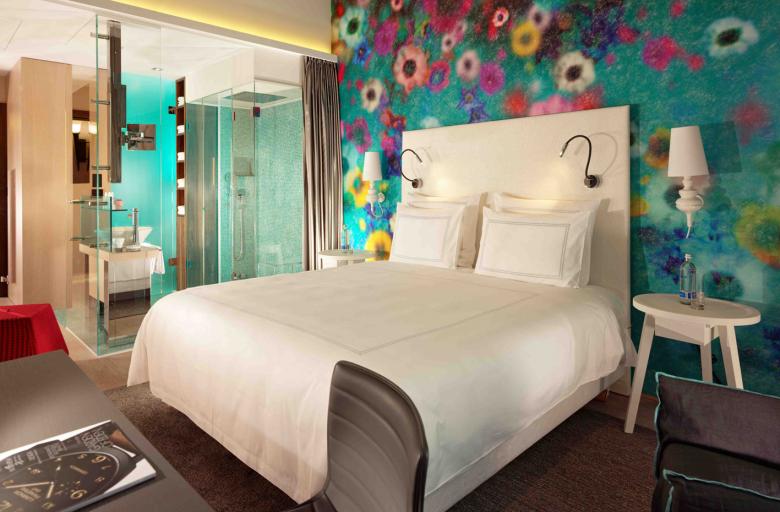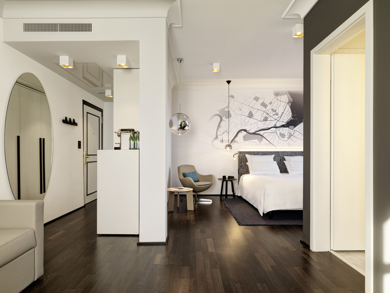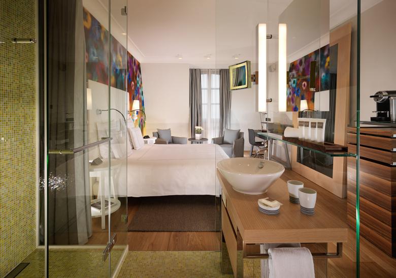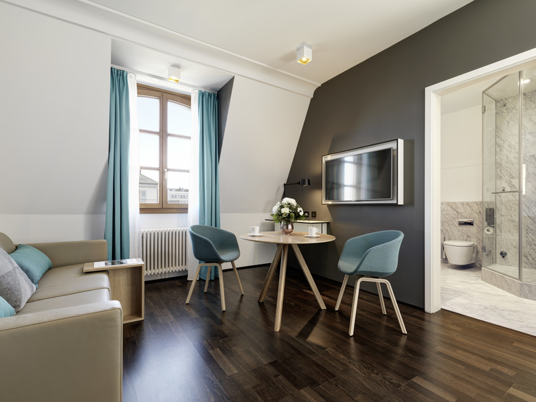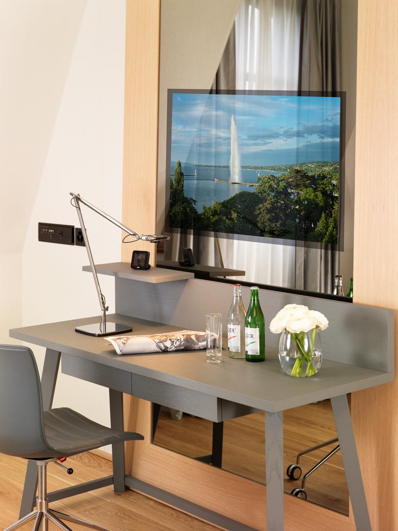 Im zweiten Satz fällt als Erstes die Grafik am Kopfende der Betten ins Auge. Schwarz auf weiss – oder in unserem Fall – weiss auf grau lassen sich filigrane Sehenswürdigkeiten der Umgebung auf der Genfer Stadtkarte finden. Gerahmte Möbel, Spiegel Türen und Spots verleihen den schlichten Zimmern und Suiten Klasse und durch die wohnlichen Leuchten und türkisen Textilien kommt heimelige Farbe ins Spiel. Wie immer spielt für uns die Materialechtheit eine grosse Rolle. So ist in den Badezimmern Carara-Marmor zum Zuge gekommen und in den Suiten laufen Sie über einen warmen Parkettboden.