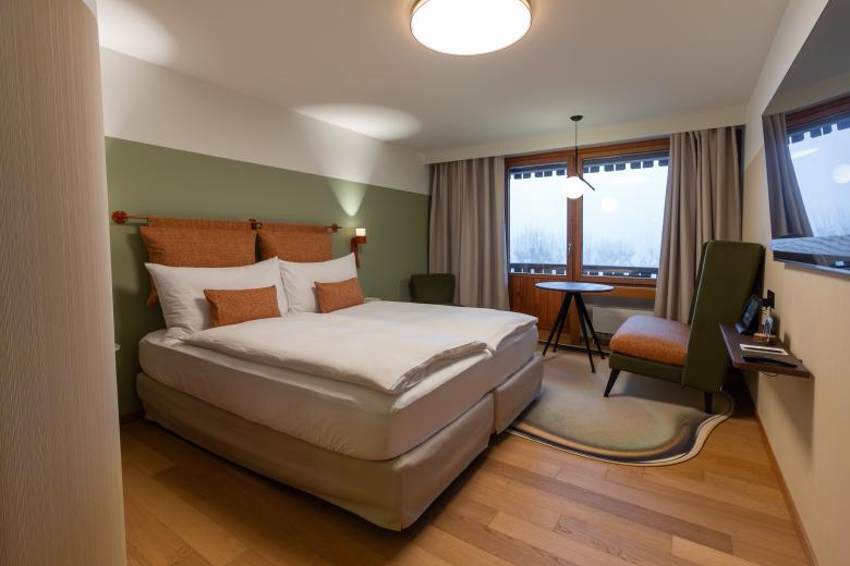 Renovation von Hotelzimmern. Die von uns vor 18 Jahren gestalteten Hotelzimmer haben wir erneut zeitgemäss renoviert. Zeitgemäss bedeutet kein Schreibtisch mehr sondern eine gemütliche homy Sitzecke, eine stylishe Möblierung mit Möbeln von Designers Guild, Moooi Carpets, Leuchten von Flos und Luxcambra und diversen eigenen Entwürfen, wie auch die Holzstoren fürs Bad.