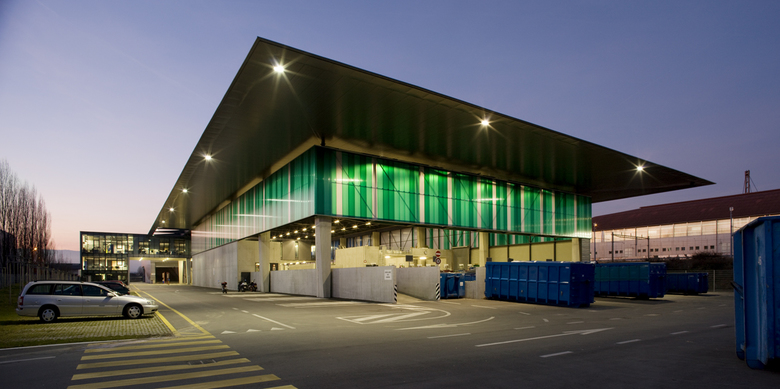 D’une apparente simplicité, le projet prend la forme d’une toiture plate sous laquelle sont rassemblées les diverses activités associées au fonctionnement du centre de logistique. Comprenant une déchèterie pour professionnels, un centre de compactage et de transbordement des déchets, un centre intercommunal de tri des déchets recyclables, un garage poids lourds, des bureaux et un réfectoire, le bâtiment compose subtilement avec toute cette machinerie. Bien que disparate dans ses affectations, l’ensemble s’harmonise grâce à la composition de l’enveloppe. Une peau translucide emballe le bâtiment en lui conférant une certaine légèreté et théâtralise à travers différentes couleurs les viscères du bâtiment.