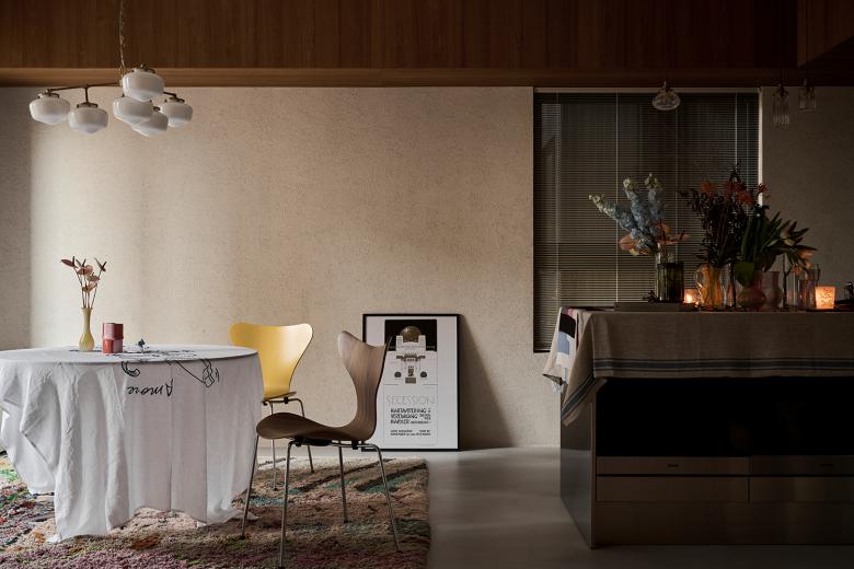 Kombination aus Holzoberflächen und holzverkleideten Einbauten, Wandflächen mit Mineralfarben, der Einsatz von Glas und Edelstahlflächen schafft eine natürliche und warme Atmosphäre. Die homogenen Materialoberflächen wirken wie eine Leinwand, während eine Auswahl an traditionellen Möbeln, Kunstwerken, Büchern und Accessoires des Eigentümers den Raum mit Spuren des Lebens füllen. Farben und Formen der Möbel und Leuchten reichen von den 1960er Jahren bis zu zeitgenössischem minimalistischem Design. Passend zum gehobenen Anspruch wurde die Wohnung mit dem JUNG Schalterklassiker LS 990 in Alpinweiß ausgestattet.