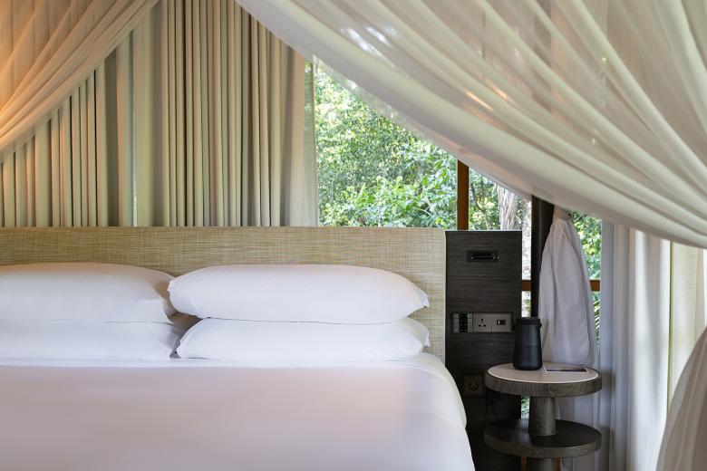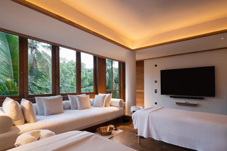 Schon der Name „Wald im Nebel“ beschreibt die Atmosphäre: ruhig, geerdet, umhüllt von tropischer Feuchte und vom Duft des Dschungels. Das von dem Designstudio Atelier Ikebuchi gestaltete Interieur spiegelt die Philosophie der gesamten Anlage wider: ganzheitlich, achtsam und mit tiefem Respekt vor Ort und Kultur. Natürliche Materialien wie Teakholz, Bambus und Eisenholzschindeln prägen die Architektur. Weiche, weiße Stoffe verleihen den Räumen Leichtigkeit und Beweglichkeit, während klassische balinesische Elemente Identität schaffen. So entsteht ein Ort, der sich nicht in die Landschaft stellt, sondern sich mit ihr verbindet. Durch die großen Fenster öffnet sich der Blick auf das dichte Blätterdach des Waldes, durchzogen vom Rauschen des Ayung-Flusses. Licht, Luft und Ruhe fließen ungehindert durch die Räume. Die Lichtplanung von Nipek, die gezielt Schatten und Akzente setzt, um die Stimmung des Hauses zu unterstreichen, unterstützt dieses Wechselspiel. Dezent in die natürliche Umgebung eingebettet sind auch die technischen Lösungen. Die eingesetzte KNX-Gebäudetechnik sorgt für intuitiven Komfort, ohne sichtbar in Erscheinung zu treten. Die Schalter und Taster der Serie LS 990 in der Farbe Lackiertes Mokka fügen sich mit ihrer reduzierten Formensprache und ihrer warmen Oberfläche mit sanftem Glanz harmonisch in das architektonische Gesamtbild ein. Auch Steckdosen und Bedienelemente greifen diesen Ton auf und bleiben dabei funktional und zurückhaltend.
