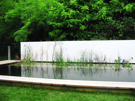 Die burgenländische-kroatische Gemeinde Draßburg ist eine Hangsiedlung und liegt zentral in einem lang gestreckten Hotter, der vom Rohrbacher Kogel über den Draßburger Wald bis in die Vulkanniederung vorstößt. Am Übergang zu dieser freien Natur und zum Wald entstand eine Neugestaltung des Gartens eines Wochenendehauses. Ergänzt wurde der Garten 3 Jahre später mit einem Schwimmteich: Trotz der ökologischen Funktion und Selbstreinigungskraft entspricht er der Ästhetik eines Pools. Die Schwimmzone von 9 Meter Länge und 3,50 Meter wird vom "Sumpf" der Pflanzzone mit Seerosen und Gräsern durch eine Unterwasserwand mit Steinkörben getrennt. Die Wassertiefe verläuft von 1,20 bis 2,20 Meter - im seichten Teil kann man in der "Wasserlounge" sitzen und das warme pannonische Klima genießen. Das Wasserbecken setzt einen bewussten Kontrapunkt zur Natürlichkeit der Umgebung; über die strenge Gartenmauer hängen die Zweige der Robinie am Beckenrand und spiegeln sich an der Wasseroberfläche. Eine Einfassung des Teiches aus Holzlattenrost rundet das Ambiente ab.