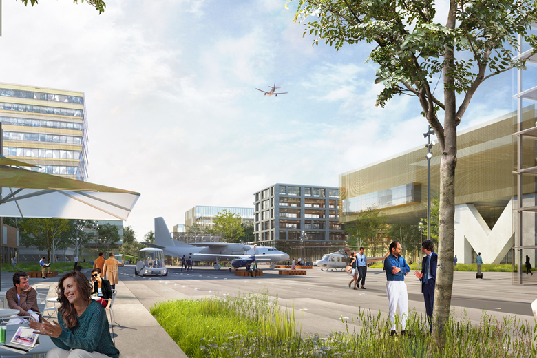 The LabCampus Airsite West aims to be an attractive working environment that is diverse, flexible and always in transformation. The proto-urban character is expressed in the skilful integration of urban qualities in a commercial working environment. As in an urban environment, high-end, experimental and temporary buildings and uses can co-exist. The LabCampus will be a cross-company and cross-sector innovation centre on the airport campus.