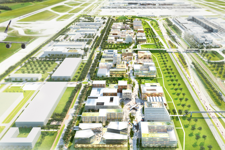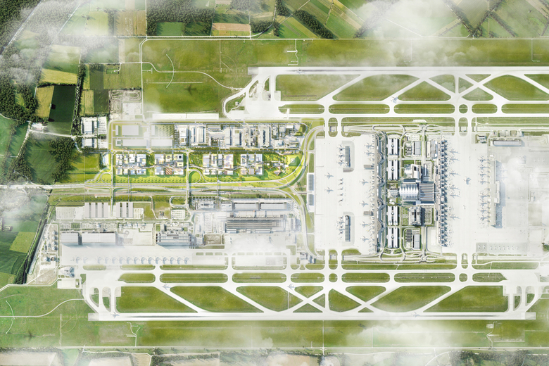 - 26 ha masterplan for ca. 500.000 m2 GFA of landside development at Munich Airport with offices, prototyping and testing spaces, corporate and brand showrooms, hotels, long-stay hotels, entertainment, lifestyle, sport and gastronomy