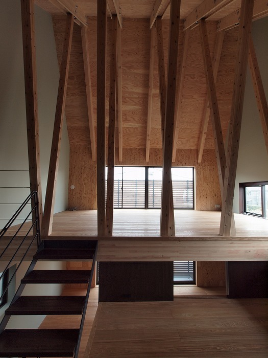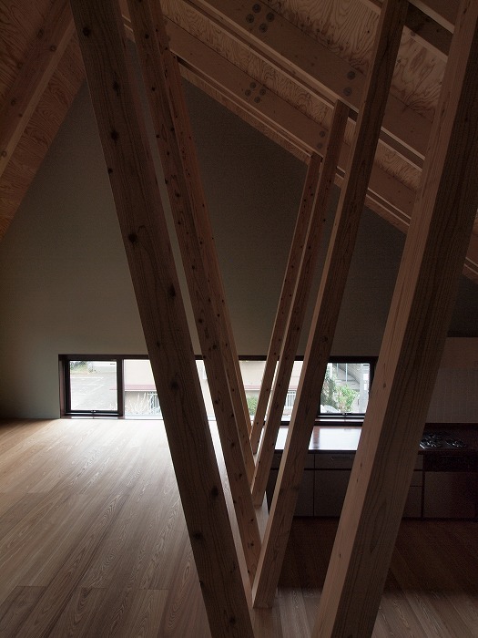 This project chooses the latter interpretation, and intentionally plays them up. The frame is composed of V-shaped posts supporting beams constructed from commonly available timber elements. These are lined up to create a space that is fairly large for a wood-framed structure. The post-and-beam sets themselves serve to define the boundaries of the space.