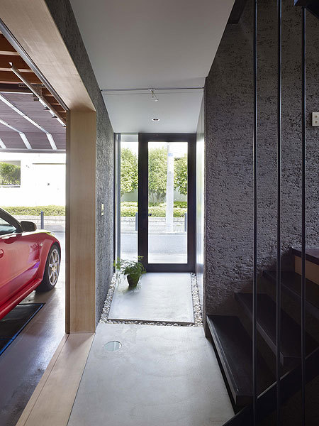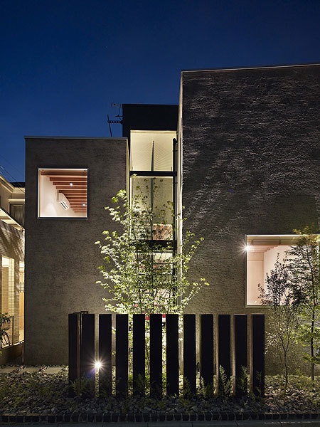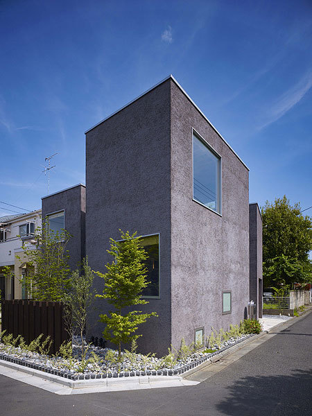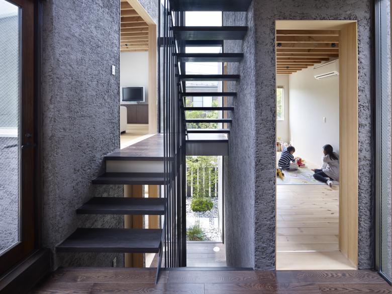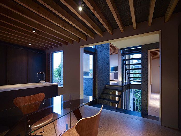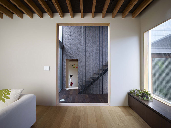 In order to create a home that does not feel boxed in by its urban surroundings, the architects divided the volume into three boxes and arranged them along the property line, then linked them with a central staircase. This allowed for the placement of windows in two sides of each box. The floor height of the boxes varies according to various site and design conditions. Residents move between the volumes via semi-exterior passageways studded with windows that look out onto a variety of scenes, bringing a sense of the passing seasons into the space.