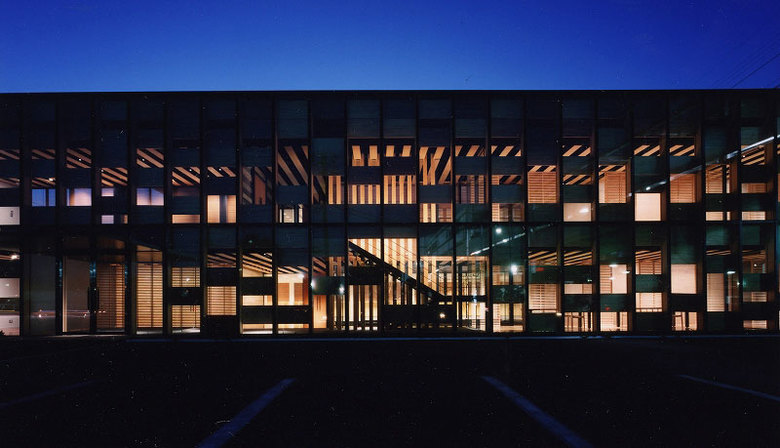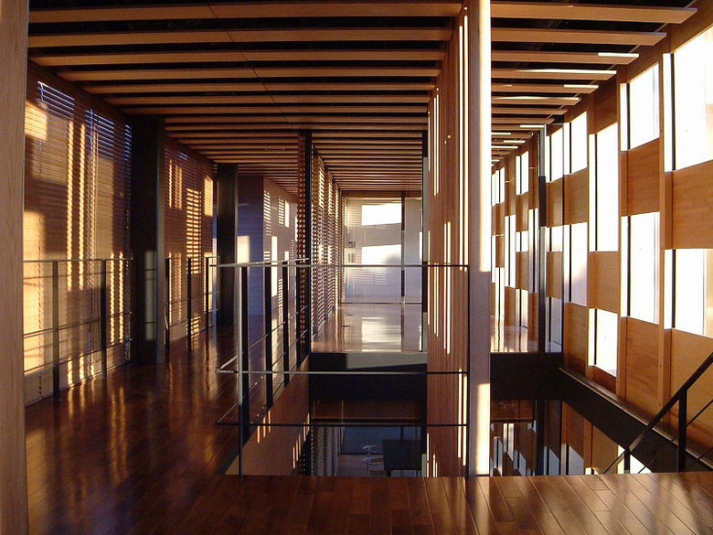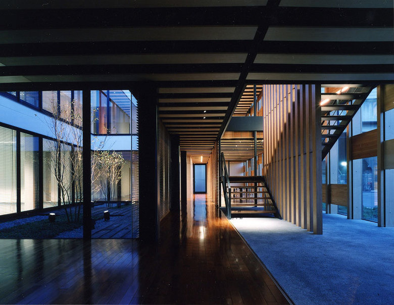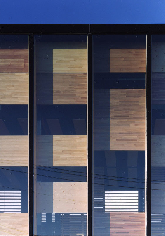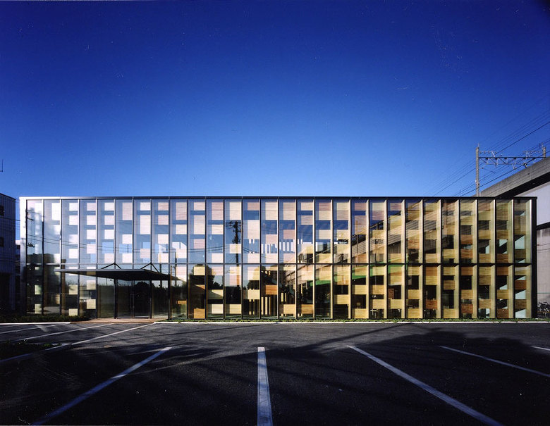 Oji Timber’s head office is located in Shinkiba, Tokyo’s historic timber industry district. Overlapping screens constructed from the many varieties of wood that Oji deals in mediate the transition from the tumult of the street to the increasingly quiet interior sphere. Viewed through the glass façade, the multi-layered wooden screens look exactly like an enormous catalogue of wood samples. The layout of the panels comprising the façade can be rearranged according to season, alleviating the temperature fluctuations that the radiated heat from the glass walls would normally cause.