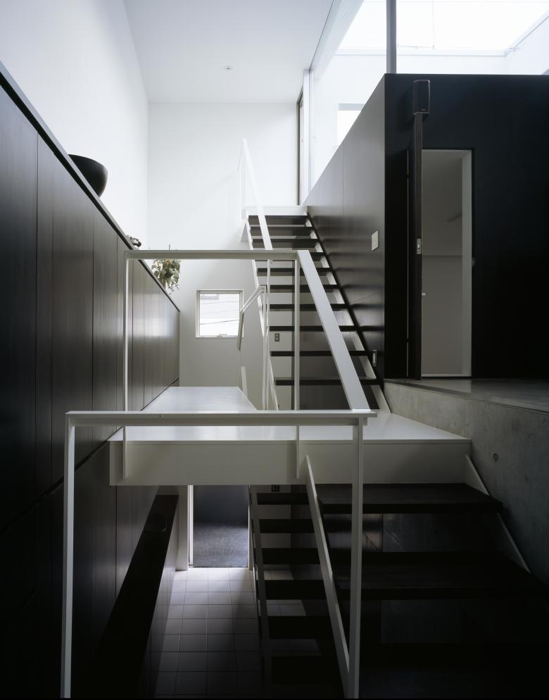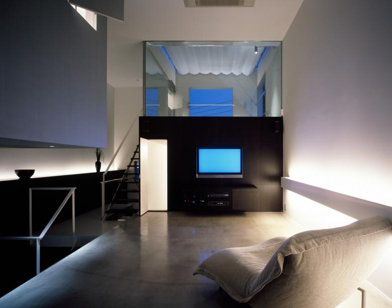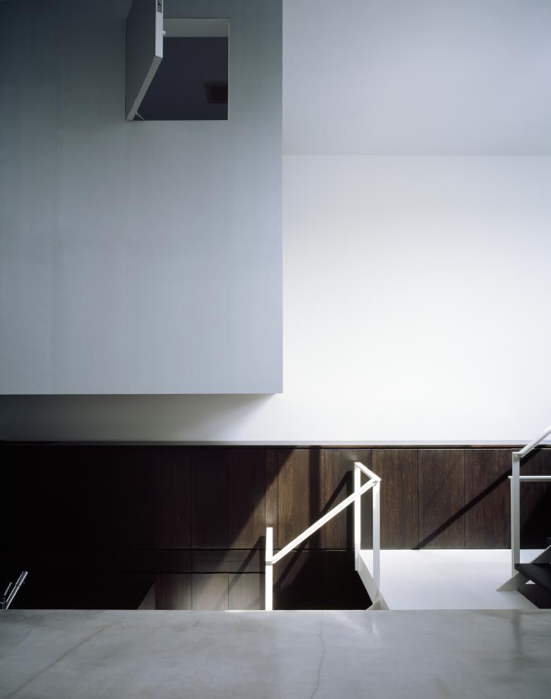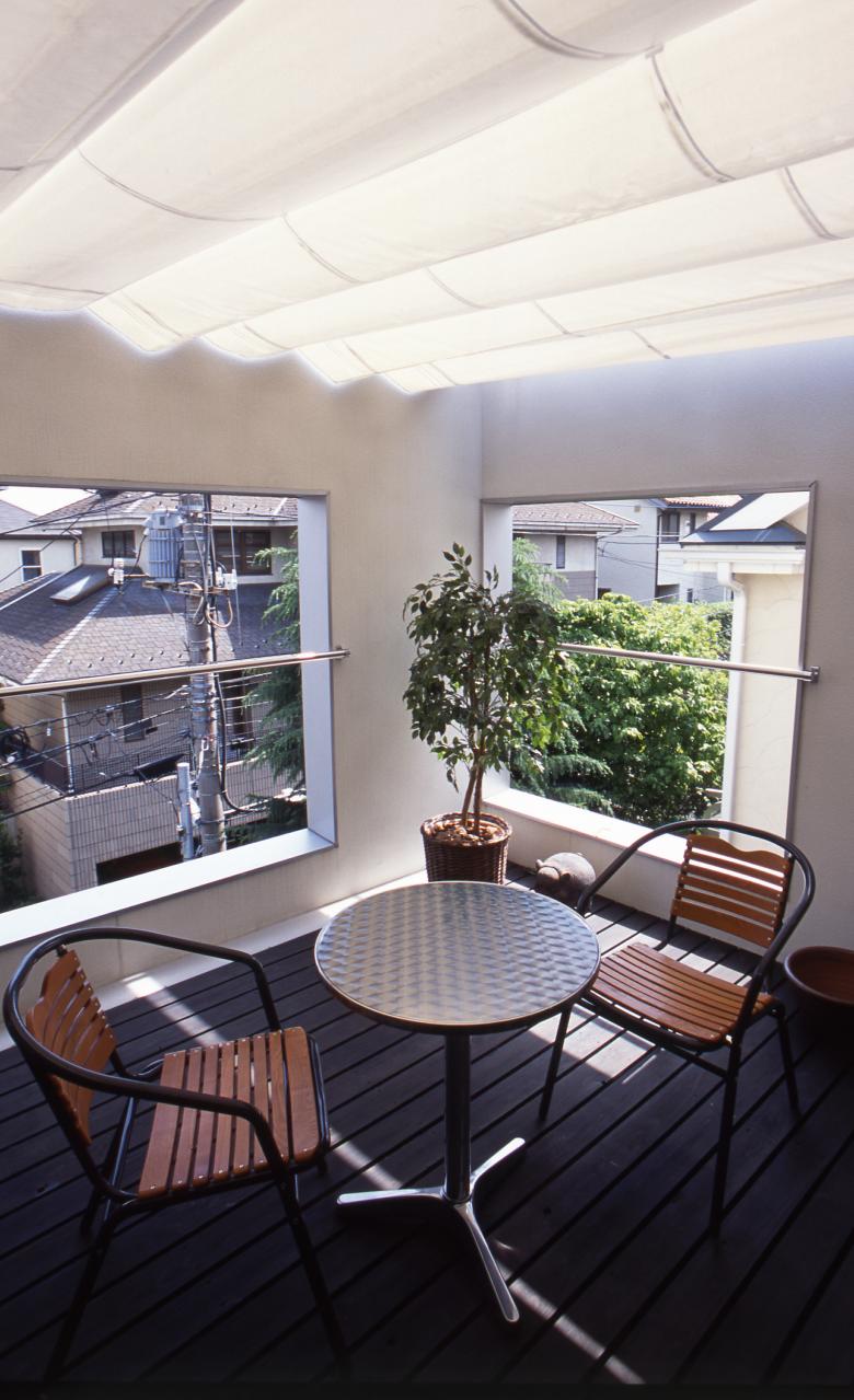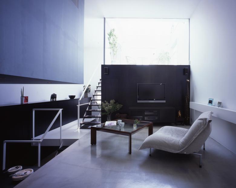 The split-level roof terrace on the southern side of this residence in a densely developed urban area serves a triple function. It allows light to flood into the living room on the far (north) side of the terrace, brings a sense of visual expansivity to the space, and provides privacy from the neighboring houses.