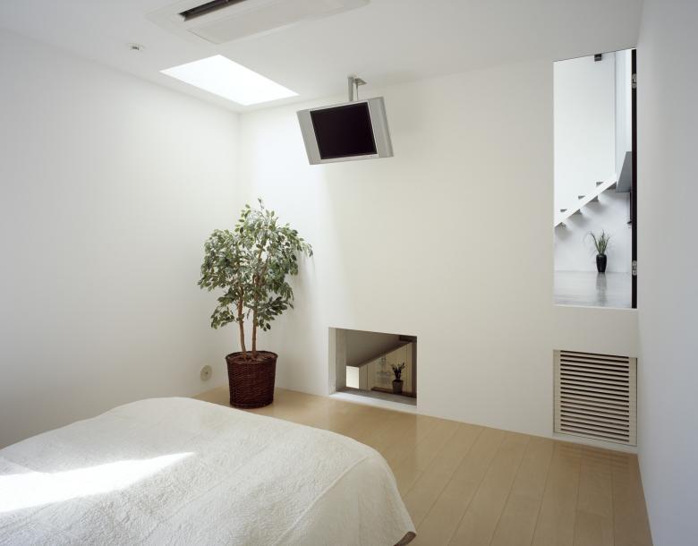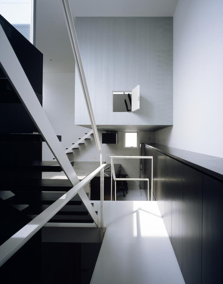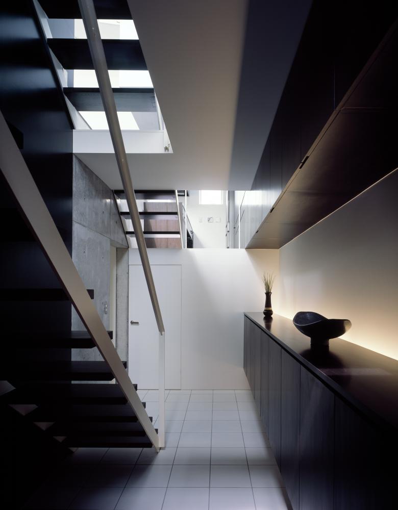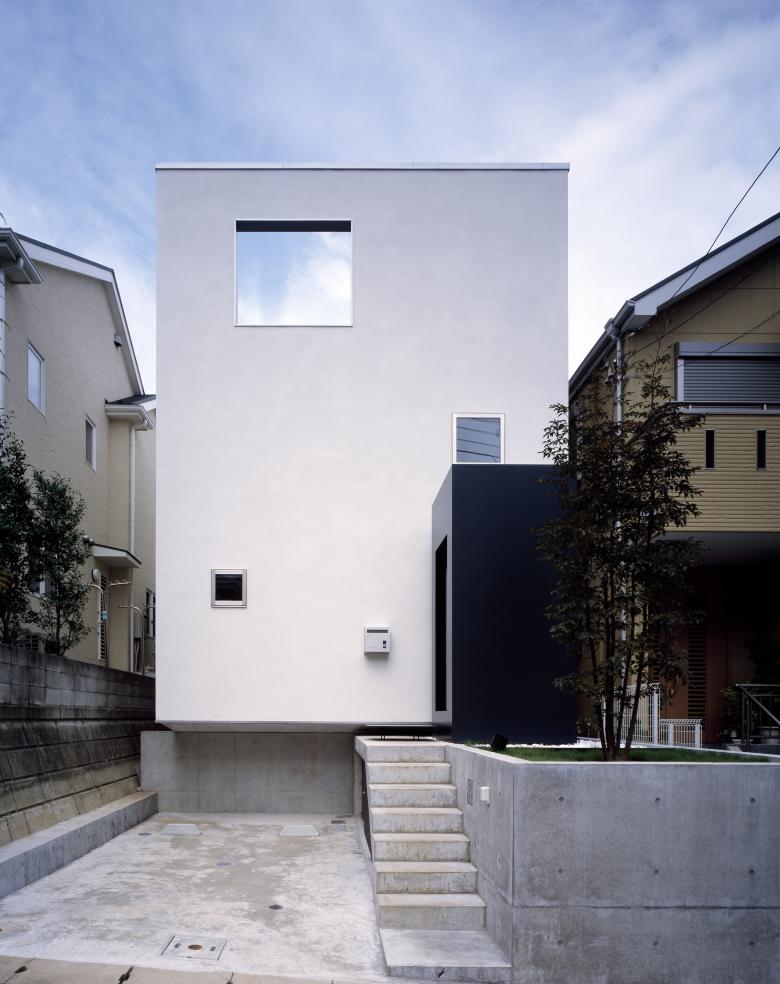 The split-level roof terrace on the southern side of this residence in a densely developed urban area serves a triple function. It allows light to flood into the living room on the far (north) side of the terrace, brings a sense of visual expansivity to the space, and provides privacy from the neighboring houses.