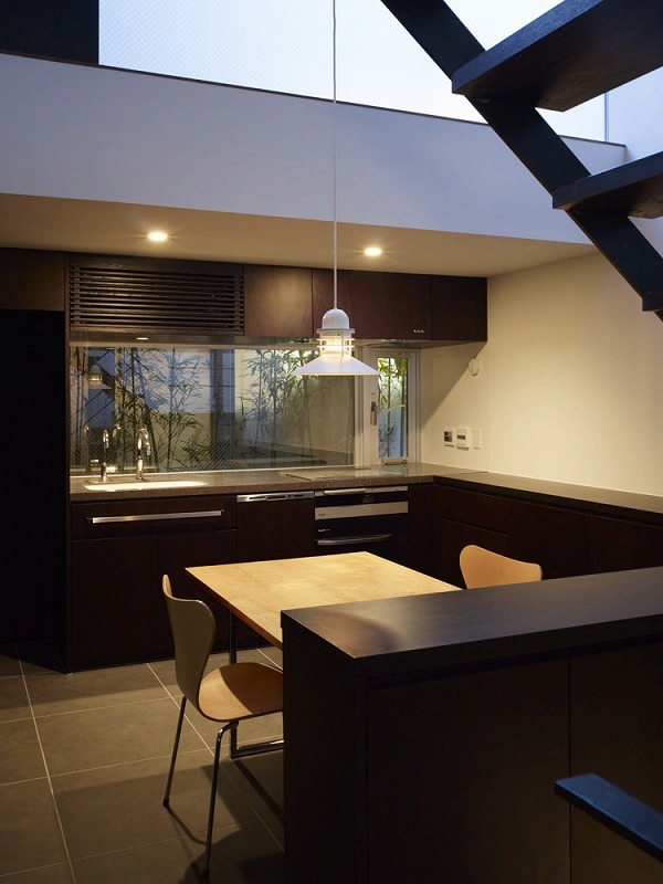 The site for this residence is surrounded on four sides by other buildings. Working within those conditions, the architects maximized the amount of natural light brought into the building from above and designed the interior so that light reaches all the way to the lower levels.