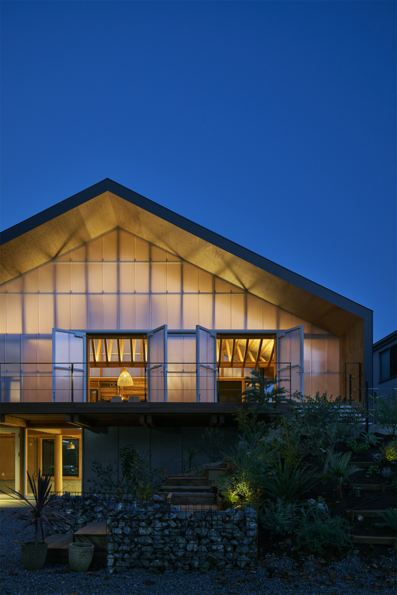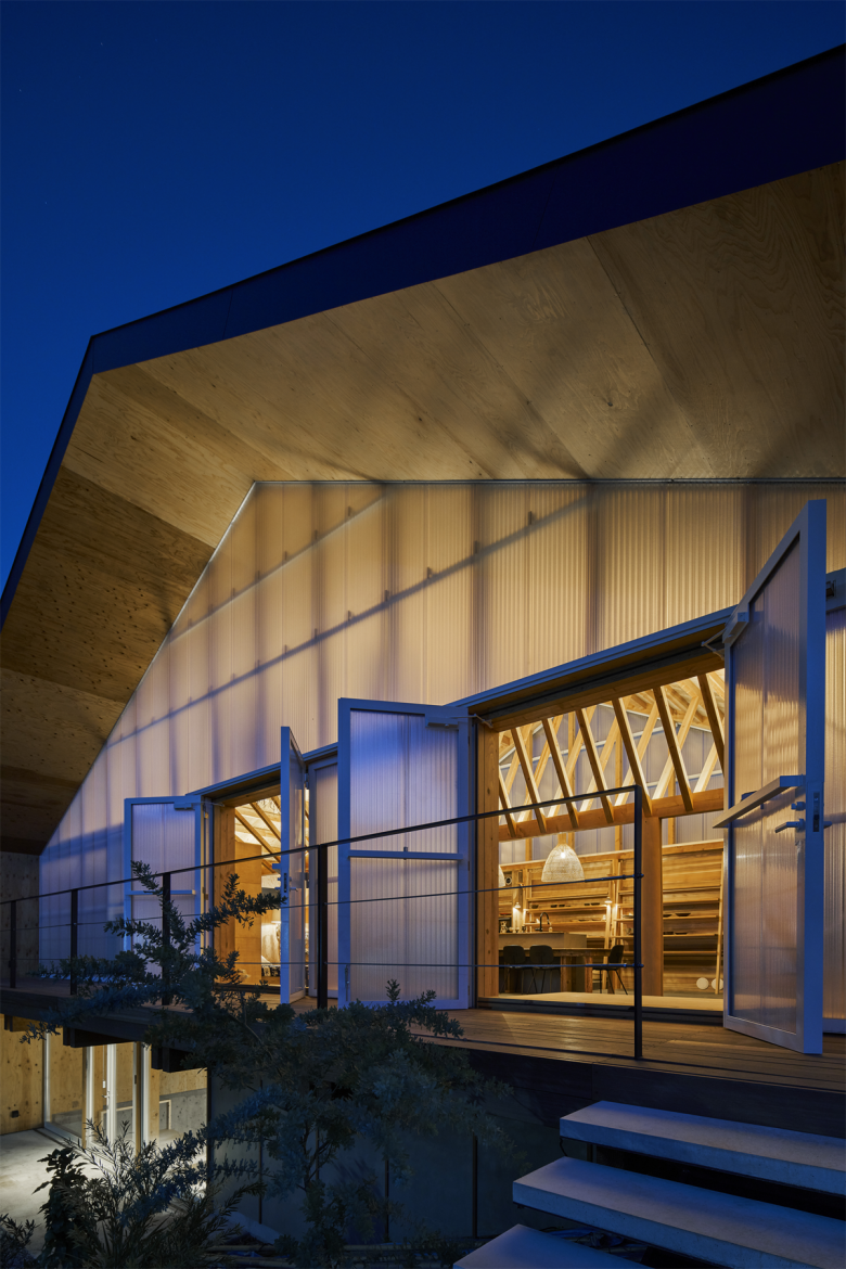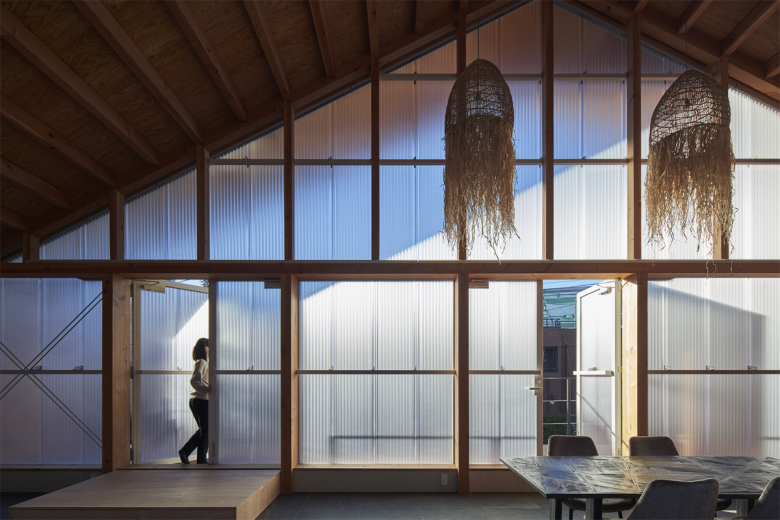 The ground floor is used for a warehouse as well as a photo studio, while the upper floor is a second house of the owner. Optimized for the purpose, the ground level has less openings to let in only modest lights into the dark space. In contrast, the upper level has full openings on the gables to brighten the space for the residential purpose. Considering the main facade was on the west, we had to cope with low-angle sun exposure as well as to block views from frequent monorail traffic. Thus, we adopted translucent polycarbonate with thick void layer for efficient insulation and thermal protection. As a result, we created a space without shadows, filled with subtle light.