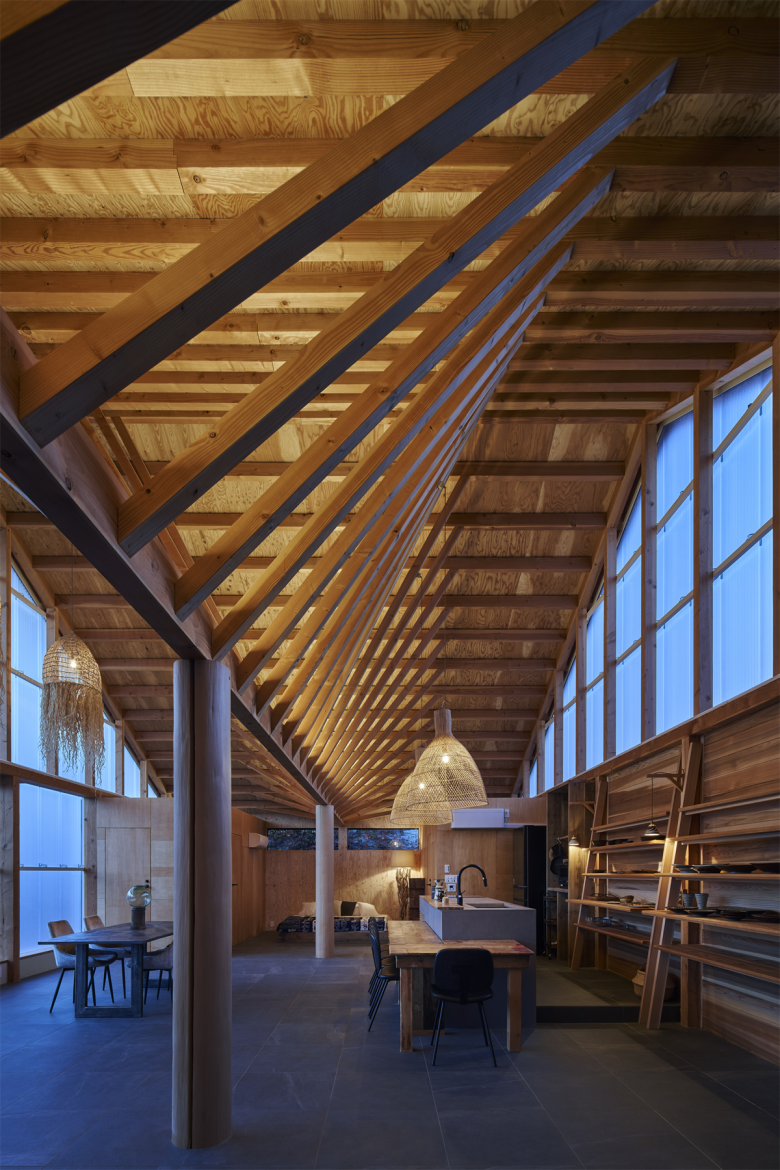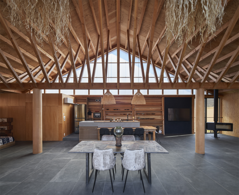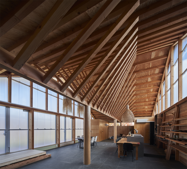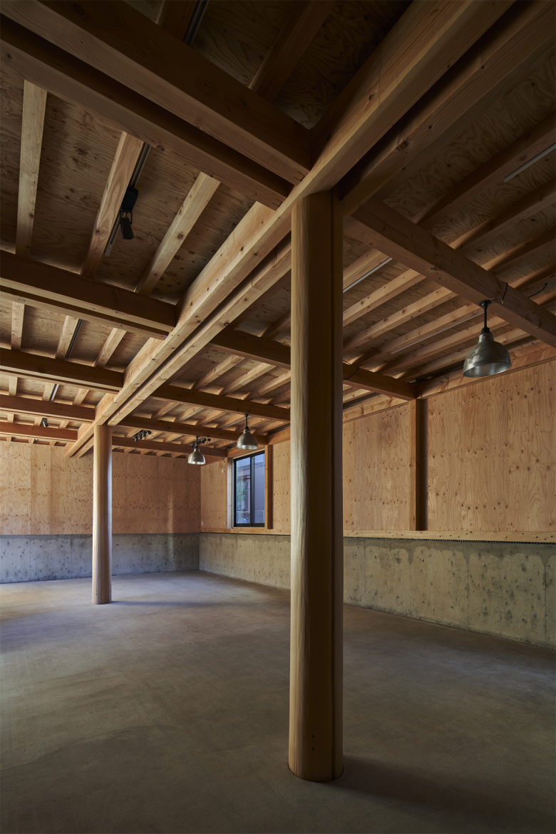 The building is an annex to the main building we designed about 10 years ago as corporate headquarters of a clothing maker and the owner’s house. The site stretches over several zones under different regulations, which led to different structure or height variations. Our choice, in contrast to the five-story RC main house which rose vertically, was to design a light wooden building in the widened area in the back of the site, in the category I exclusively low-rise residential zone. The exposed timber frame structure is composed of the lower structure with two-story posts, and the roof structure with 90 by 90 mm timber struts which, supporting the purlins, shift in angles and form HP surfaces. These two structures—the lower and the roof—together with the intervening floor frame in between create a unique and generous single space on each level.