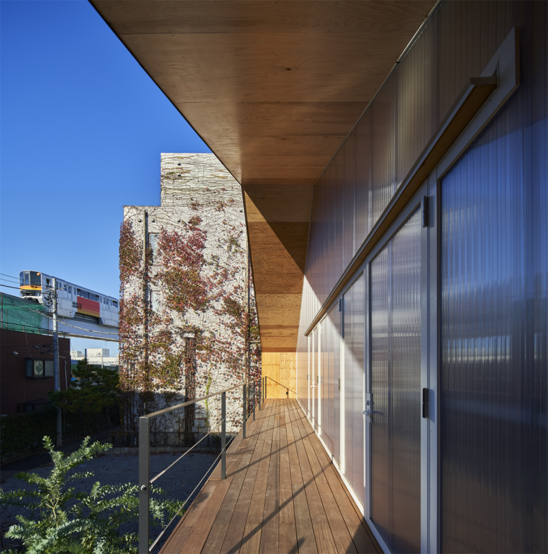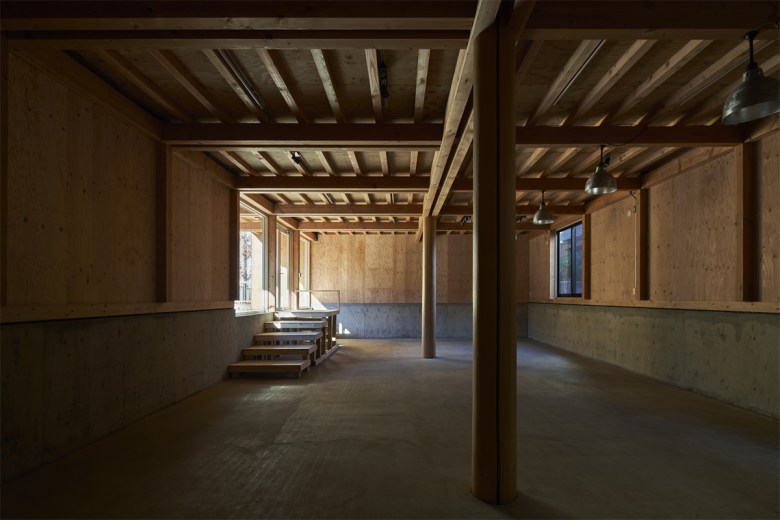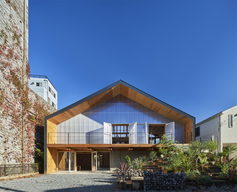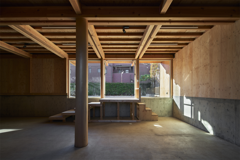 As the bearing ground level was only about 1m below surface, we put the mat foundation on that level and used the slab as the ground floor. The soil dug for the foundation was mounded up to the upper level to connect the residential floor with the ground. The light facade with full opening—though translucent—gives a feel of temporary facility and opens to the town. This annex, surrounded by the main building and other detached houses, aims at presenting a new and unclassified townscape in the way it’s used, the scale, and how it emerges as architecture.