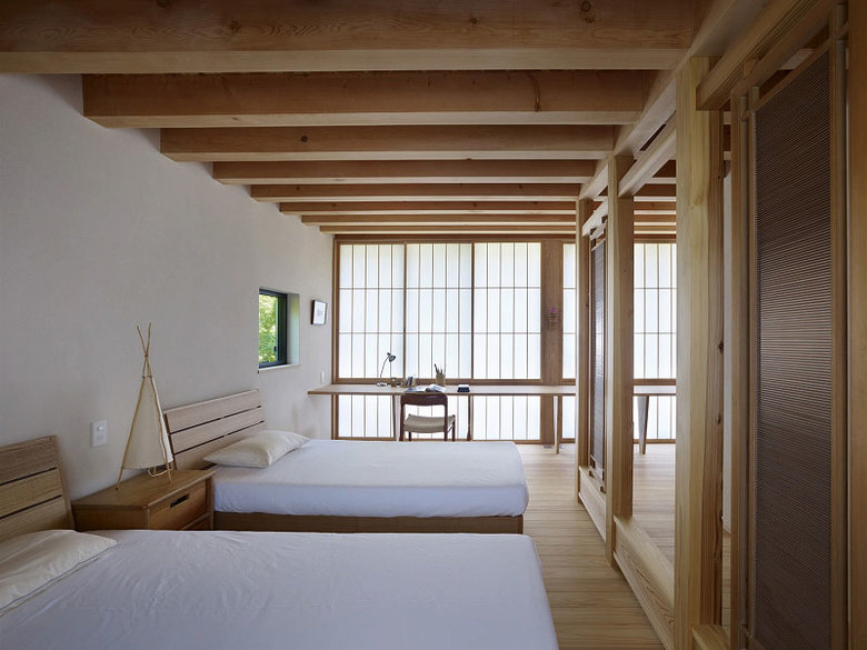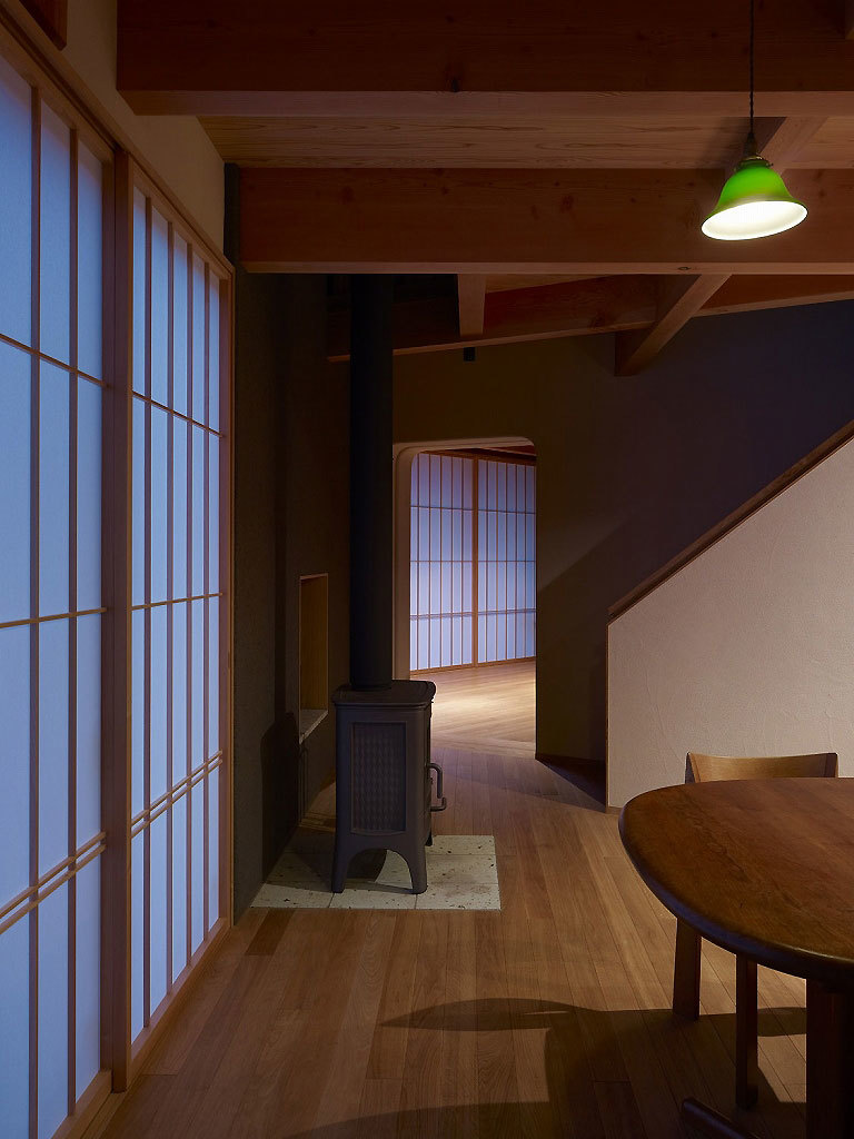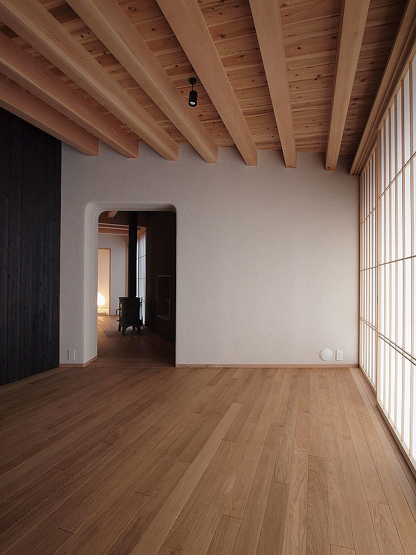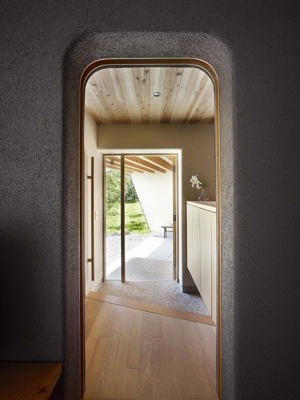 Situated in the foothills of Mt. Yatsugatake, this vacation home gently incorporates the natural environment around it. The fan-shaped design opening to the south means plenty of sun streams in during the cold winters: no matter the time of day there’s always a place to bask in the sun. In contrast, strong summer sunshine is blocked by a roof and side walls that protrude beyond the façade, providing shade. Windows in the north and south exterior walls bring cool breezes into the house. The result of these design strategies is a structure that is simple yet filled with a rich diversity of scenes.