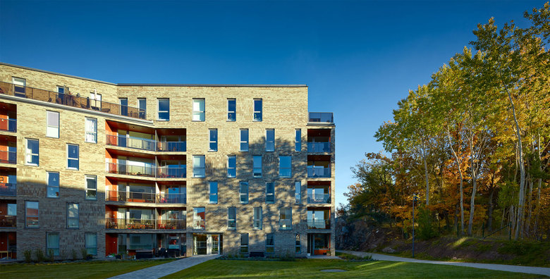 The plot is on a slope between a waterway bordering onto Sundbyberg in the north and the new neighborhood park to the south. In the original master plan the plot was intended for 6 tower blocks, but in order to make the most of the site's topography and create a connected garden around all three houses, K + S chose to join the 6 buildings to form 3 parallel, twice folded six-storey buildings. The resulting shape in plan gives the buildings a distinct direction that accentuates and enhances those inherent in the plot.