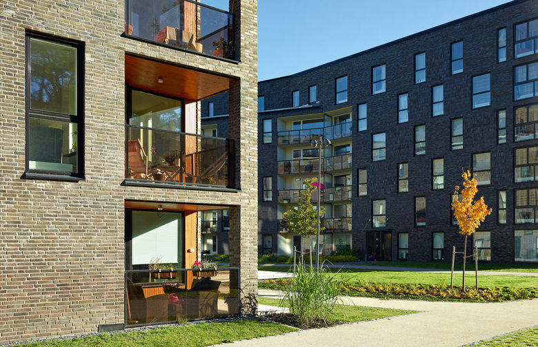 The plan configuration creates interesting outlooks from the apartments and helps to reduce noise from the nearby rail traffic. The buildings' brick facades have three colour variations, pattern effects in the brickwork designed to be visible from a distance, which is the project's handling of the larger scale. Details such as the materiality of the insides of the balcony niches differentiate the various buildings. The apartment buildings have recessed balcony niches with generous glazing and light glass handrails - the outdoor space virtually resembles an indoor room, offering a good climate and shelter all year round. The partially retracted top storey has a varied façade, flush with that of the rest of the building at some points but otherwise set back, thus providing roof terraces.
