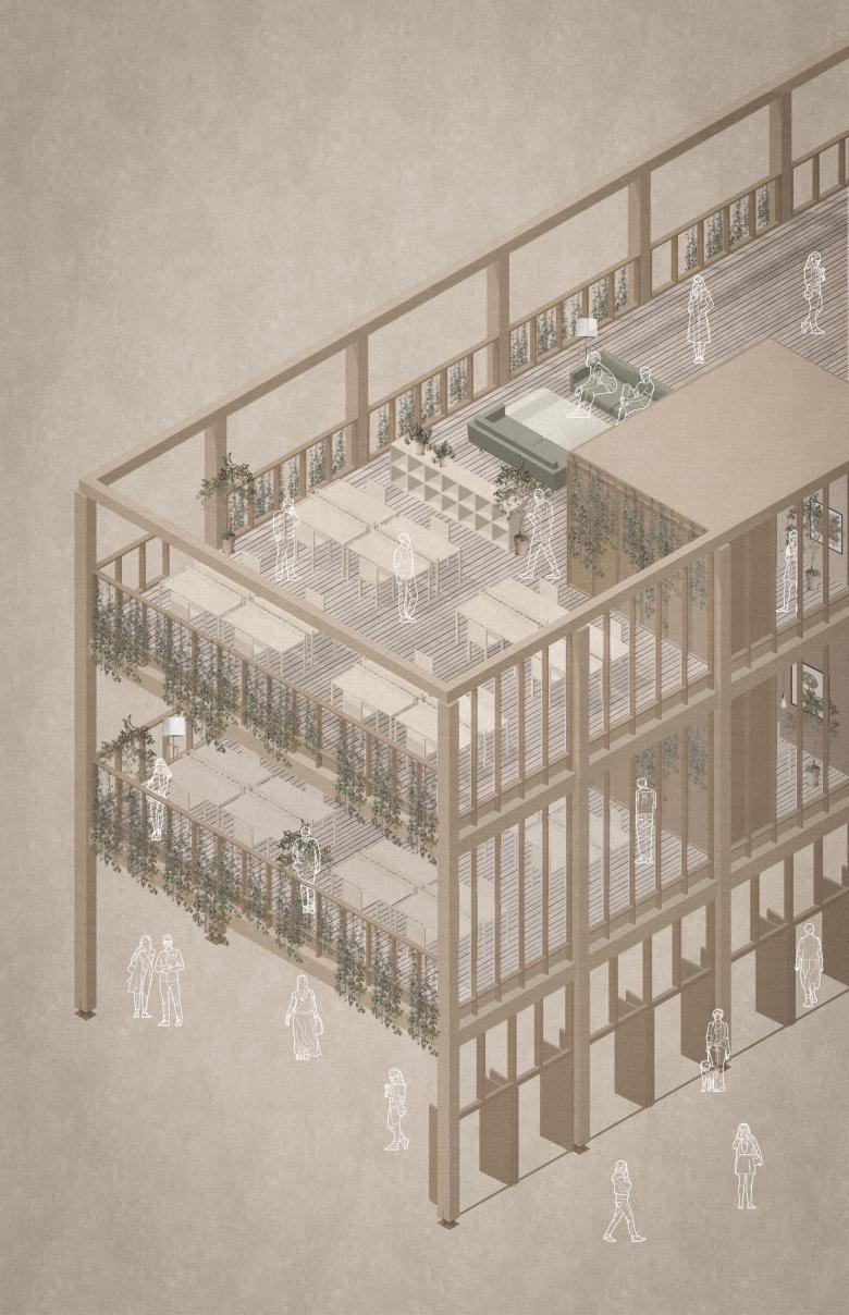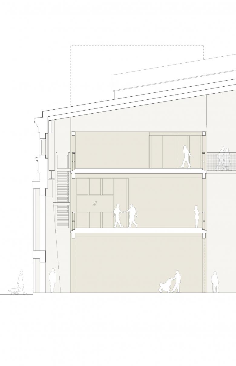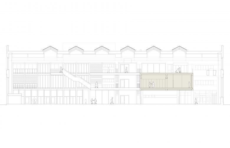 The material sustainability is a main strategy aiming to minimize use of resources and climate impact by making smart material choices. Besides the preservation of building elements, new construction is mainly made of timber to minimize carbon dioxide emissions and the overall ecological footprint. Timber is also a light-weight material, which reduces the load put on the existing structure and therefore the need for a new foundation. Complementary materials make use of recycled and upcycled materials recovered from demolitions in the area: brick, chequer plates, stairs, steel profiles, perforated sheet metal and many more.