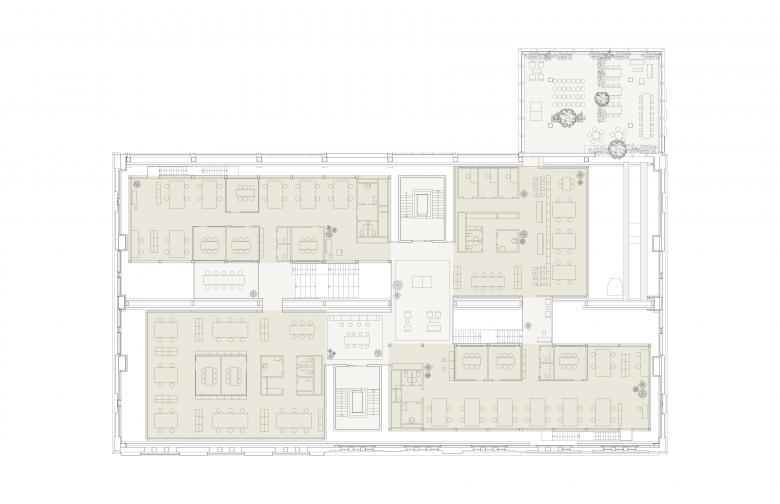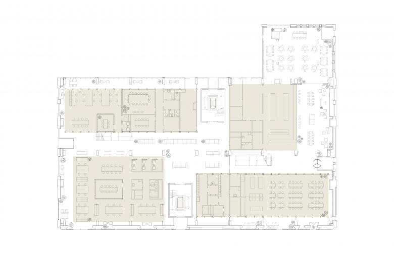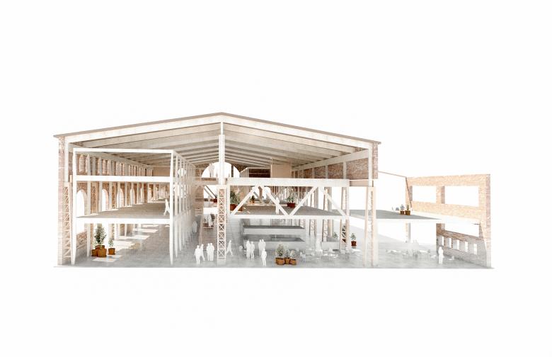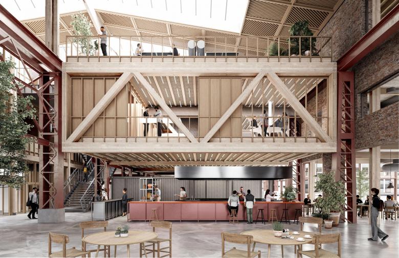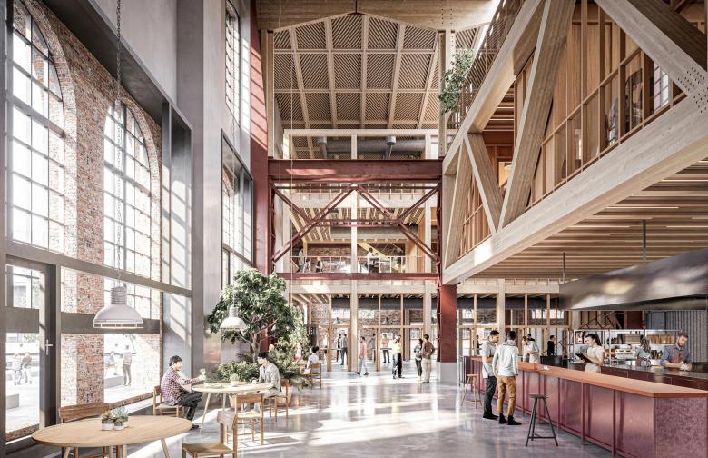 The added timber structure, detached from the walls and hung from the roof, keeps a distance to the existing structure to preserve the spatial quality of the large hall. The new elements create a variation of spaces suitable for new programmes – meetings, social interaction, creativity, exhibitions, food and beverages. The design allows daylight from the tall windows and roof lanterns to penetrate through the entire broad and deep space.