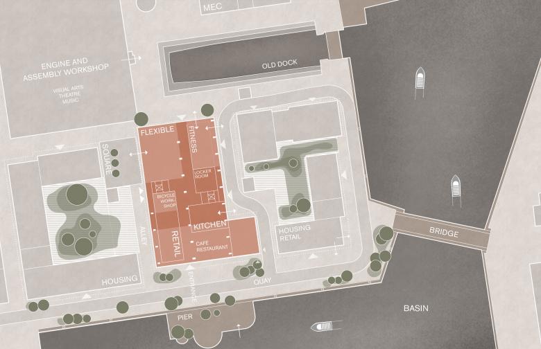 Two of the newly introduced volumes are hung from the remaining overhead crane runways to decrease the need for supporting columns and thus allowing for a free open programming on the ground floor. Main entrance, lobby, café and a restaurant are located to the south, facing the quay. The proposed programming acts as a link between the existing dry dock to the north and the new square to the west. The interior layout is rational and flexible, based on the existing loadbearing structure and allowing for four individual tenants on each floor, vertically interconnected by large longitudinal stairs in the central atrium and two side staircases with lifts.
