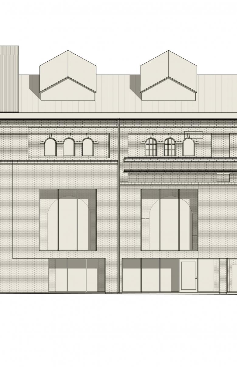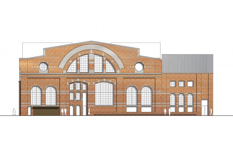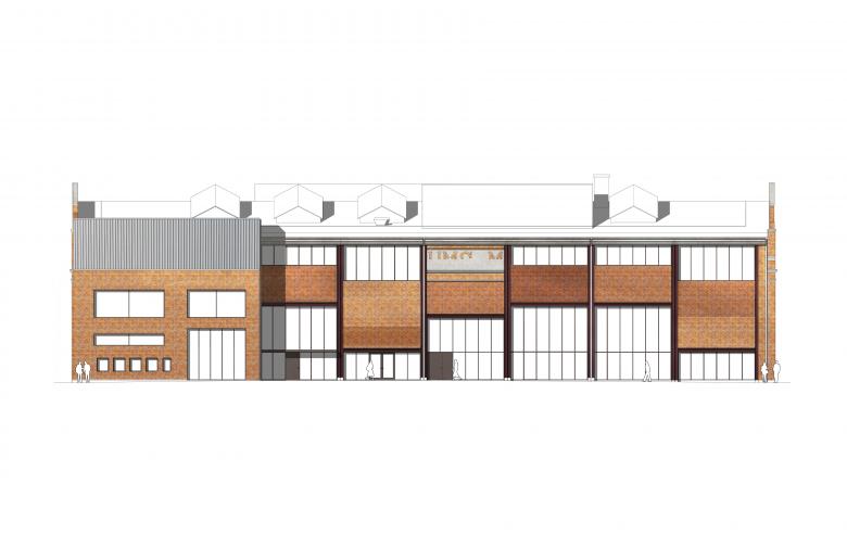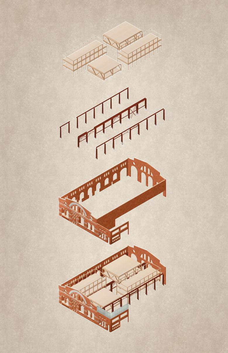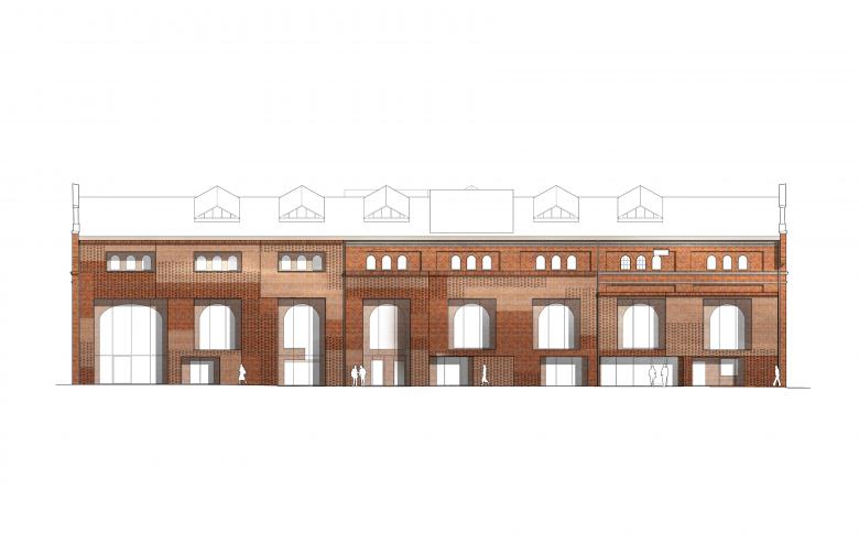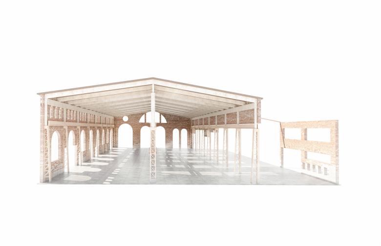 The west façade, formerly an interior wall, is a rich collage with remains of demolished building components. The intention is to preserve this expression, designing a new building envelope with a distinct tectonic solution. The original openings, bricked up in the past, are reintroduced, exposing the brick wall to the interior whilst adding an entirely new insulated façade from recycled brick reclaimed from recently demolished Kockum’s buildings on the outside. Overlaying the restored original openings on the inside with the new curtain walls on the outside creates an unconventional composition.