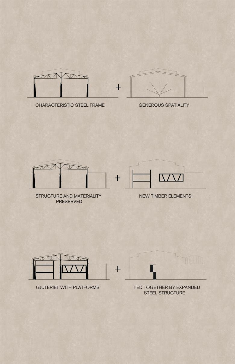 Gjuteriet, although currently in a state of a ruin exposed to elements and winds, sparks interest and imagination. Roofing felt has been torn off and roof lanterns removed. East and west facades are heavily fragmented. The approach to the transformation can be defined as a reinterpretation of an architectural heritage where various time periods coexist with how we experience the architecture today.