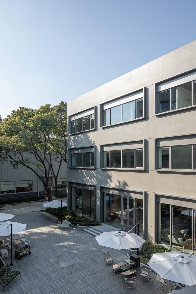 Further modification to the buildings’ exterior includes smart boxed window frames. Clad in aluminum panels and surrounded by concrete colored plaster, they are consistent with the system of materiality devised for NIO spaces. Cementing the building’s strong first impression and further amplifying the delivery center’s frontage is a redesigned visitor entrance. Sitting in the middle of the three connected buildings, it boasts a large canopy as well as a ramp for full accessibility.