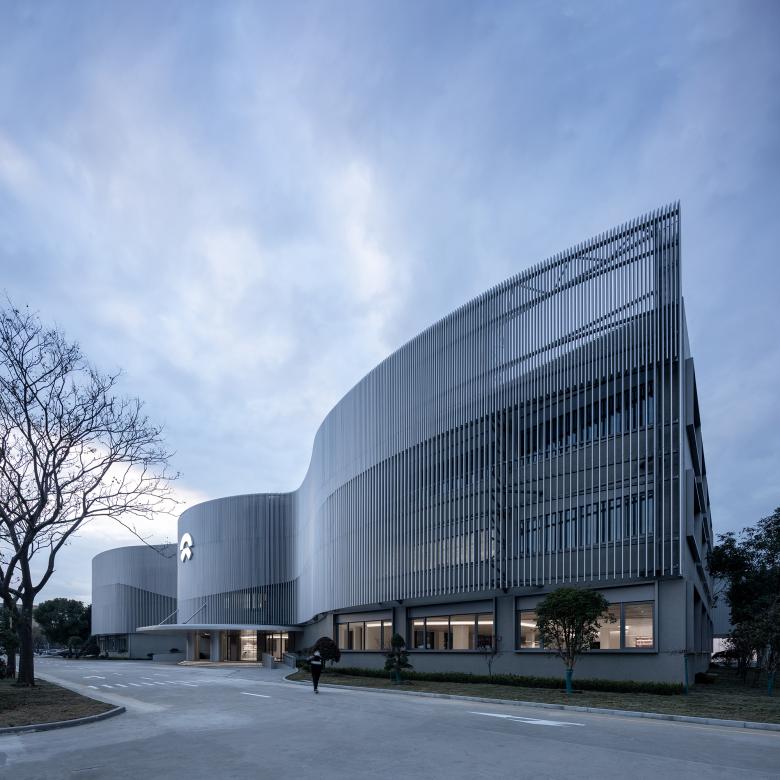 The most striking element of Kokaistudios’ renovation is a bright silver facade. A system of vertical aluminum profile louvers follows the curved ‘bridges’ that connect the three buildings, resulting in an undulating exterior and unified flow that appears to move with the viewer. Effectively an open screen masking the linked volumes behind, it affords plentiful natural light into both the office and visitor area. Highly visible from the street, the facade transforms the building into a local landmark, all the while resonating with NIO’s brand identity of purity and elegance.
