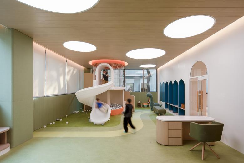 Inside, the entrance is an airy, welcoming space that sets the tone for visitors’ experience. On the one side is a guest reception desk, and on the other, a display featuring NIO’s lifestyle-oriented products including books, clothing, and food. Behind is a soft play area aimed at the delivery center’s youngest visitors: so-called ‘Joy Camp’, they are a feature of the recently redefined NIO design template that takes direct inspiration from the family home. Further reinforcing the delivery center’s strong lifestyle focus, an adjacent lounge invites parents to take a break while keeping an eye on their children.