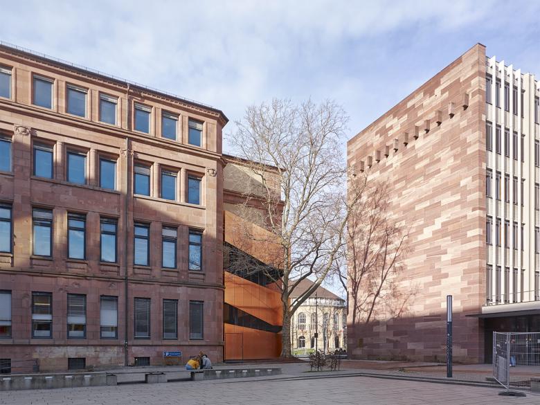 Eine bestehende Platane galt es zu erhalten und neben der Funktion als Fluchttreppe auch die Zuluftansaugung des benachbarten Kollegiengebäudes II unauffällig in die Gesamtgestaltung zu integrieren. Die Fluchttreppe ist somit auch Lüftungsbauwerk.