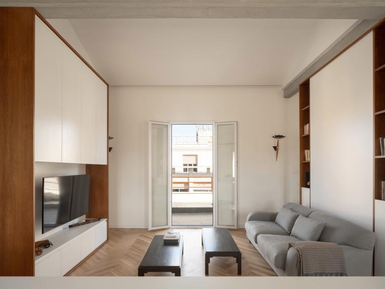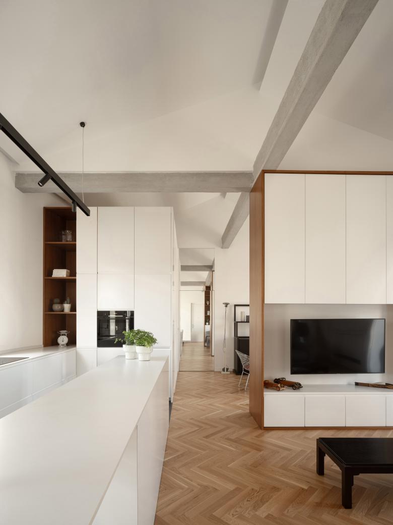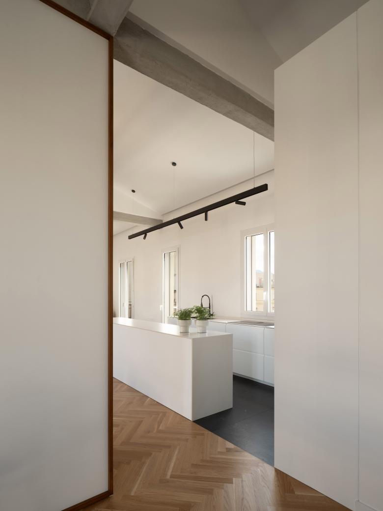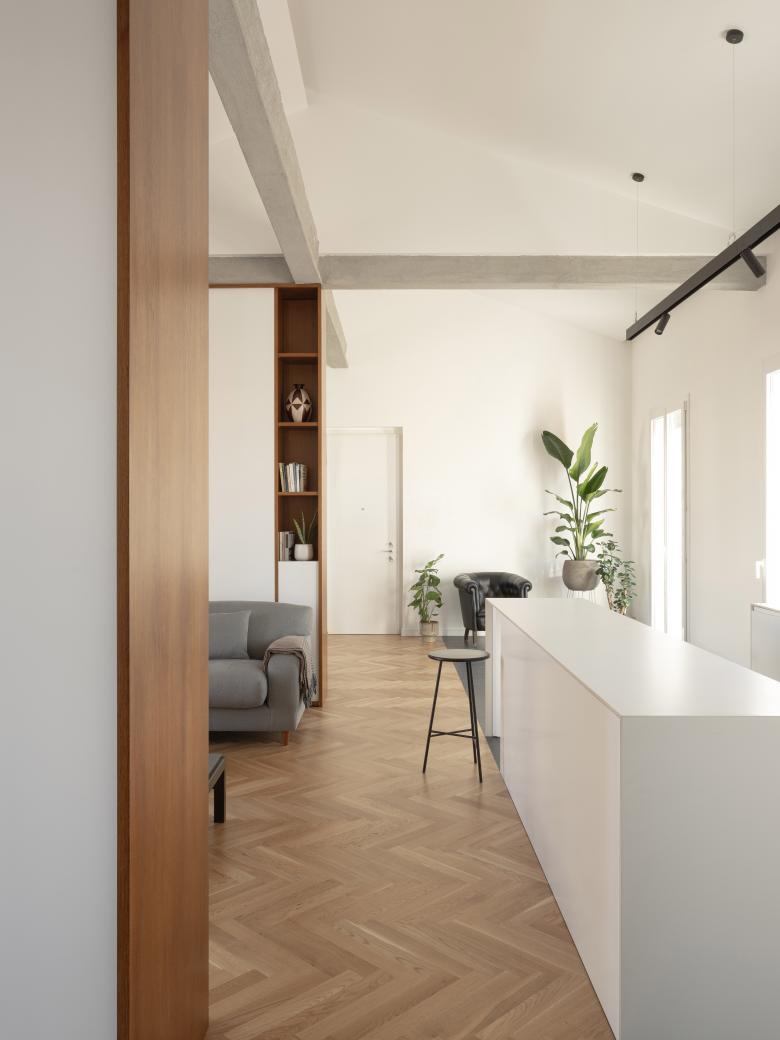 Situata all’ultimo piano di un palazzo degli anni 50’, dalle sue aperture si scorge il campanile della Chiesa di San Francesco di Paola e l’impianto settecentesco della Villa Filippina. La casa si sviluppa su una pianta rettangolare di 165 m², il passo viene scandito dagli elementi strutturali del fabbricato che costituiscono uno dei caratteri fondativi del nuovo progetto insieme al soffitto a falde alto sino a 5 metri, riportato alla luce durante le demolizioni. Il progetto si misura con gli elementi fondativi dell’immobile, organizzando lo spazio giorno in maniera fluida, diviso da “quinte” che dividono il grande living, rivestendo i pilastri alti 3,20 m, su cui poggiano le travi lasciate volutamente a facciavista. Le due quinte scandiscono lo spazio, si suddivide così l’ingresso dal salotto e dalla zona pranzo, la cucina “open”, viene invece definita dal cambio di pavimentazione, l’isola stretta e lunga collocata a filo con il cambio di pavimentazione la divide dal resto. La zona notte viene collocata in fondo alla casa, separata dal living da una porta a specchio che la nasconde completamente, qui trovano posto le due camere da letto, la padronale è dotata di un bagno “en suite” e di cabina armadi, le porte sono su disegno in legno di rovere e alte tre metri, viene disegnata inoltre una quinta in legno listellare ponendo il letto al centro della camera e filtrando alle sue spalle una zona riservata.