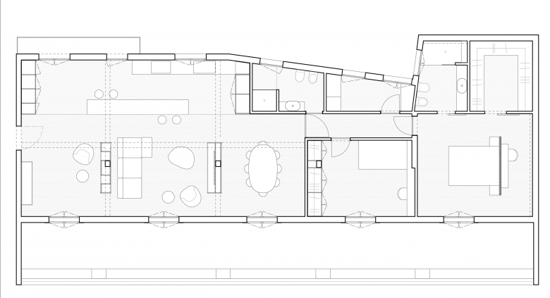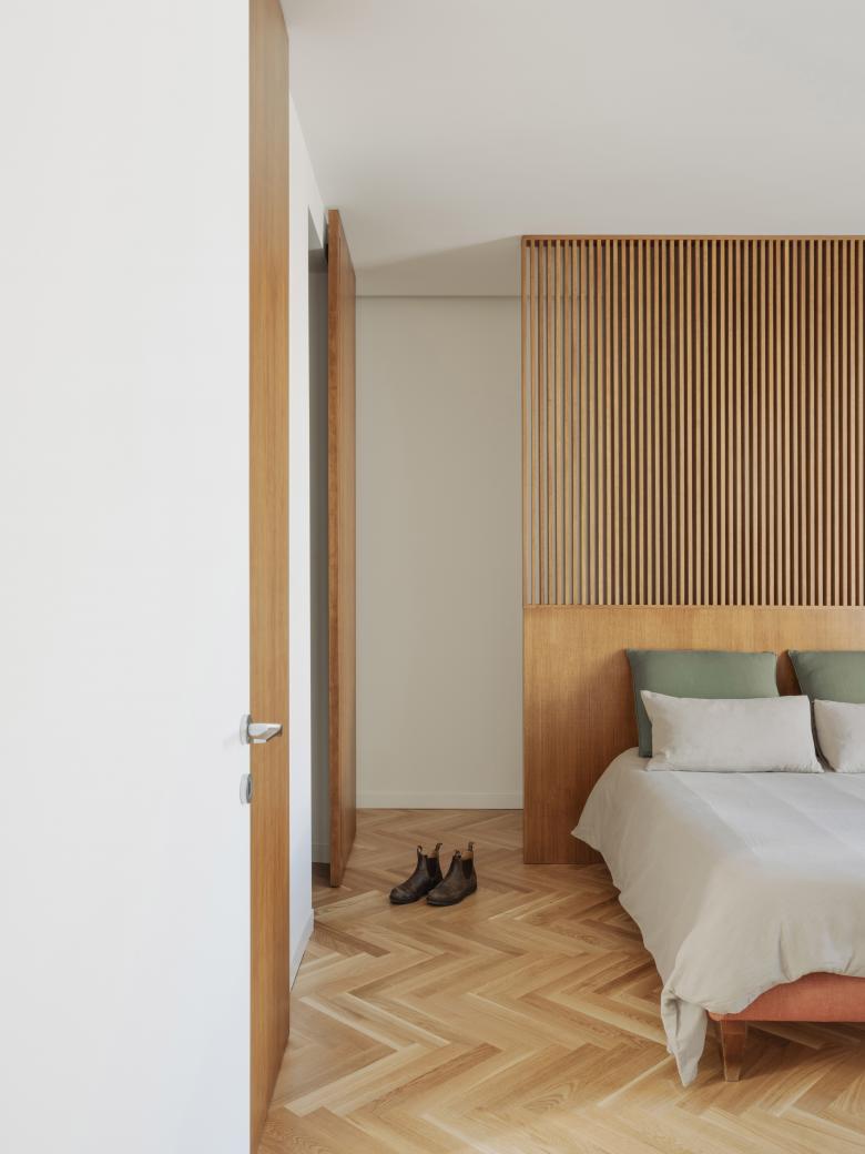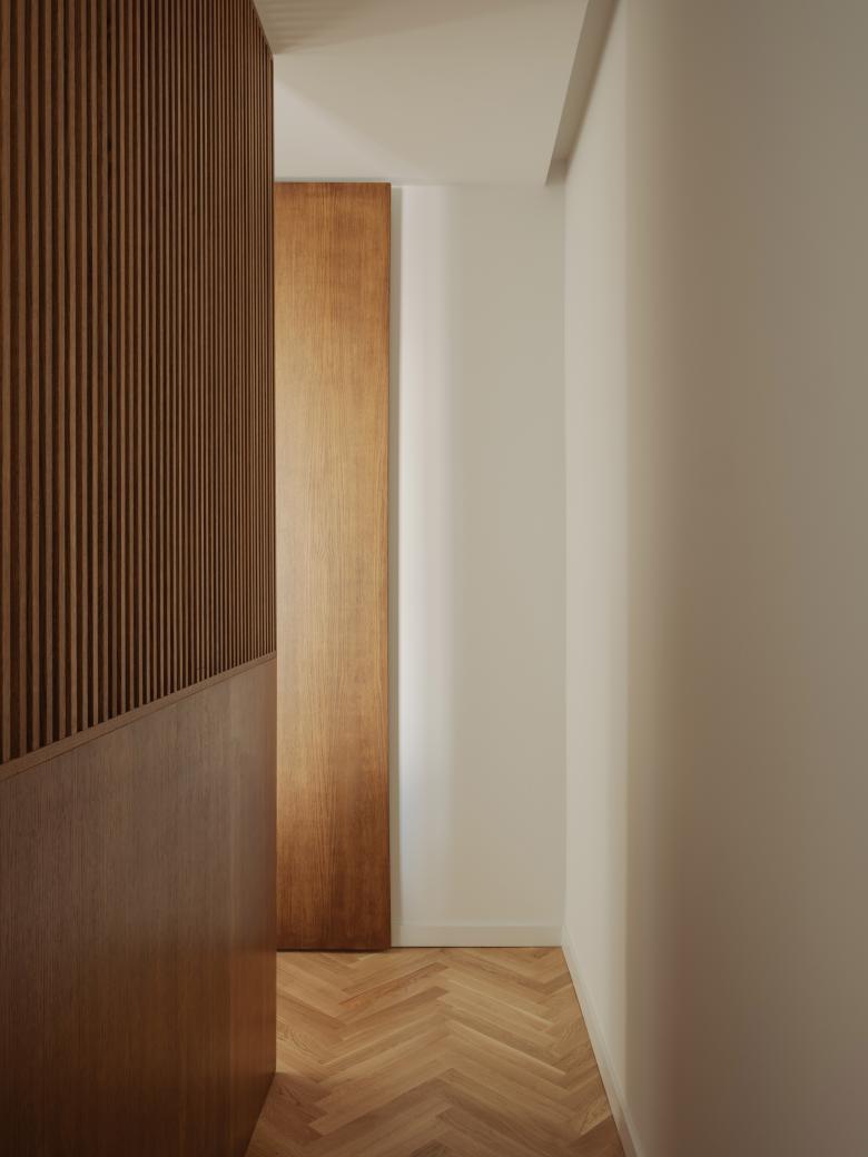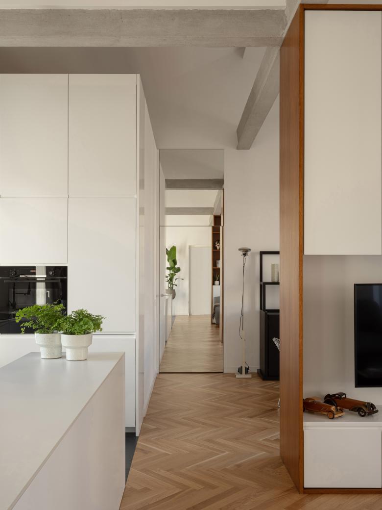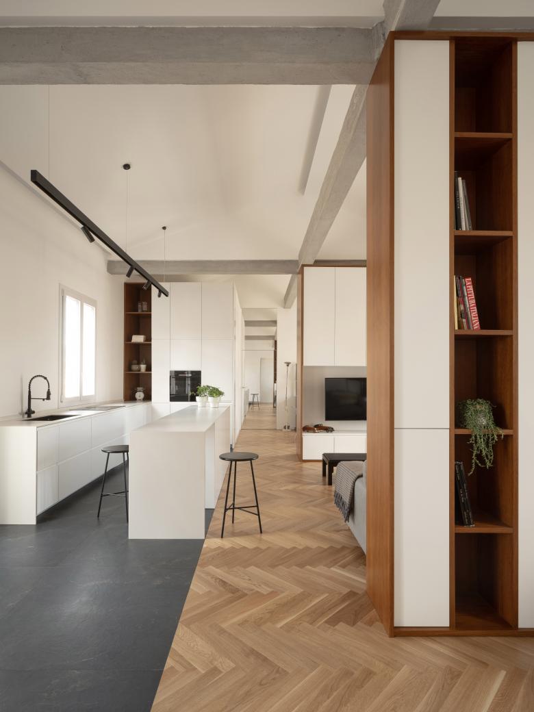 Situata all’ultimo piano di un palazzo degli anni 50’, dalle sue aperture si scorge il campanile della Chiesa di San Francesco di Paola e l’impianto settecentesco della Villa Filippina. La casa si sviluppa su una pianta rettangolare di 165 m², il passo viene scandito dagli elementi strutturali del fabbricato che costituiscono uno dei caratteri fondativi del nuovo progetto insieme al soffitto a falde alto sino a 5 metri, riportato alla luce durante le demolizioni. Il progetto si misura con gli elementi fondativi dell’immobile, organizzando lo spazio giorno in maniera fluida, diviso da “quinte” che dividono il grande living, rivestendo i pilastri alti 3,20 m, su cui poggiano le travi lasciate volutamente a facciavista. Le due quinte scandiscono lo spazio, si suddivide così l’ingresso dal salotto e dalla zona pranzo, la cucina “open”, viene invece definita dal cambio di pavimentazione, l’isola stretta e lunga collocata a filo con il cambio di pavimentazione la divide dal resto. La zona notte viene collocata in fondo alla casa, separata dal living da una porta a specchio che la nasconde completamente, qui trovano posto le due camere da letto, la padronale è dotata di un bagno “en suite” e di cabina armadi, le porte sono su disegno in legno di rovere e alte tre metri, viene disegnata inoltre una quinta in legno listellare ponendo il letto al centro della camera e filtrando alle sue spalle una zona riservata.